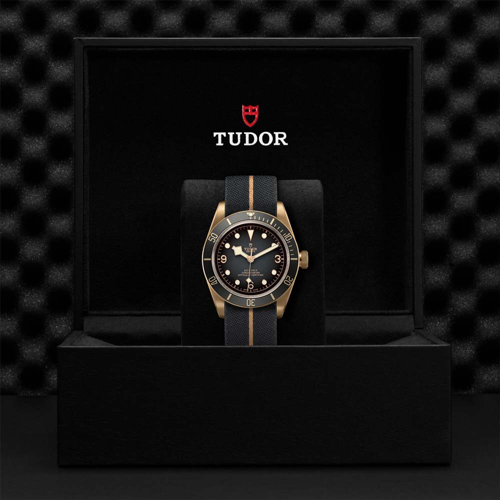 The TUDOR Black Bay Bronze, a divers’ watch inspired by the brand’s history and fitted with the TUDOR Manufacture Calibre MT5601 offering an approximate power reserve of 70 hours. This 43mm timepiece boasts a bronze case with bronze-coloured PVD-treated steel case back and satin finish. The off-white Super-LumiNova hand and hour markers contrast the slate grey dial, which is framed with a unidirectional rotatable bezel in bronze with 60-minute graduated disc in matt slate grey anodised aluminium. Finally, it is fitted with a slate grey fabric strap with a bronze-coloured centre stripe and bronze buckle.