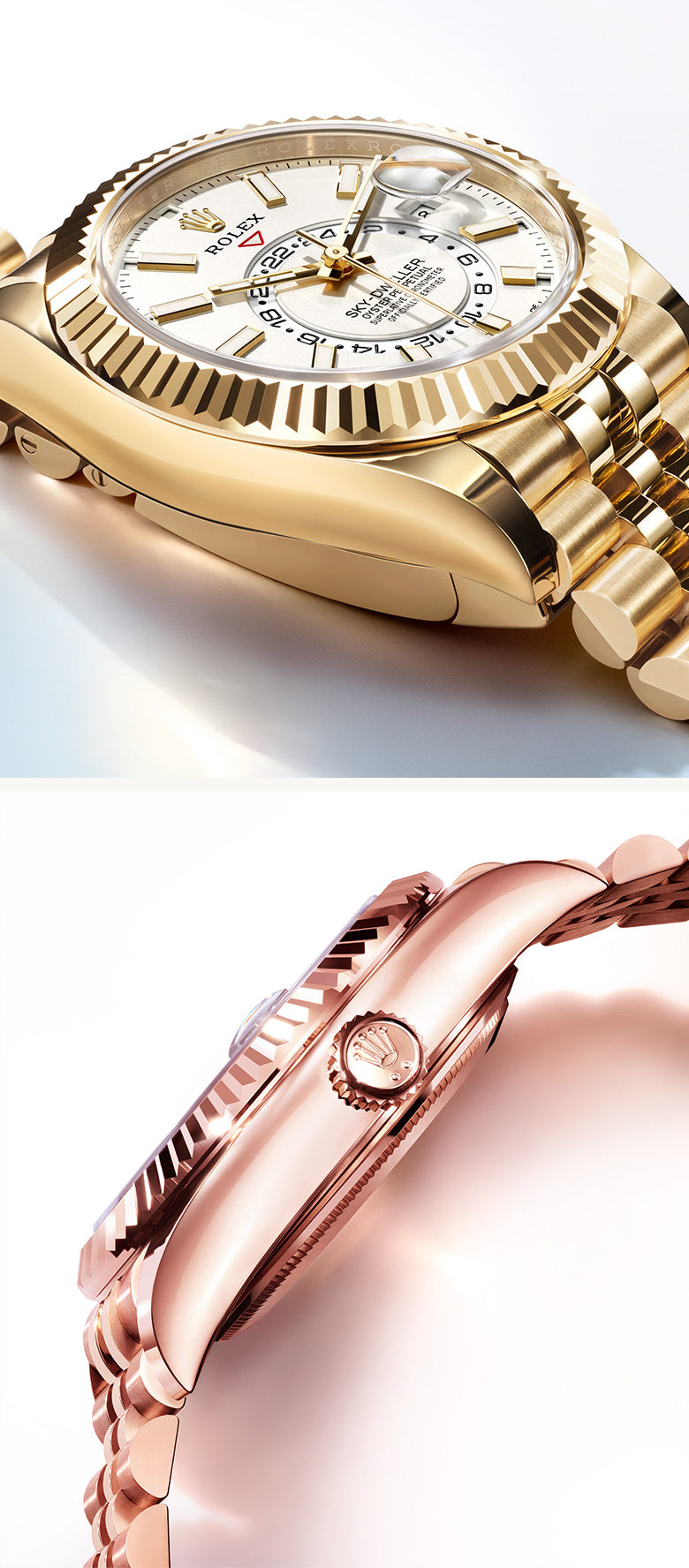 Rolex presents two new 18 ct gold versions of the Oyster Perpetual Sky-Dweller, each sporting a Jubilee bracelet. It is the first time that this watch for world travellers has been fitted with a Jubilee bracelet in precious metal.