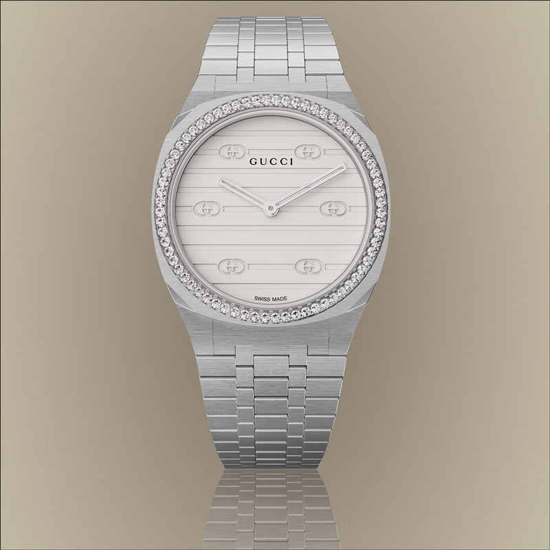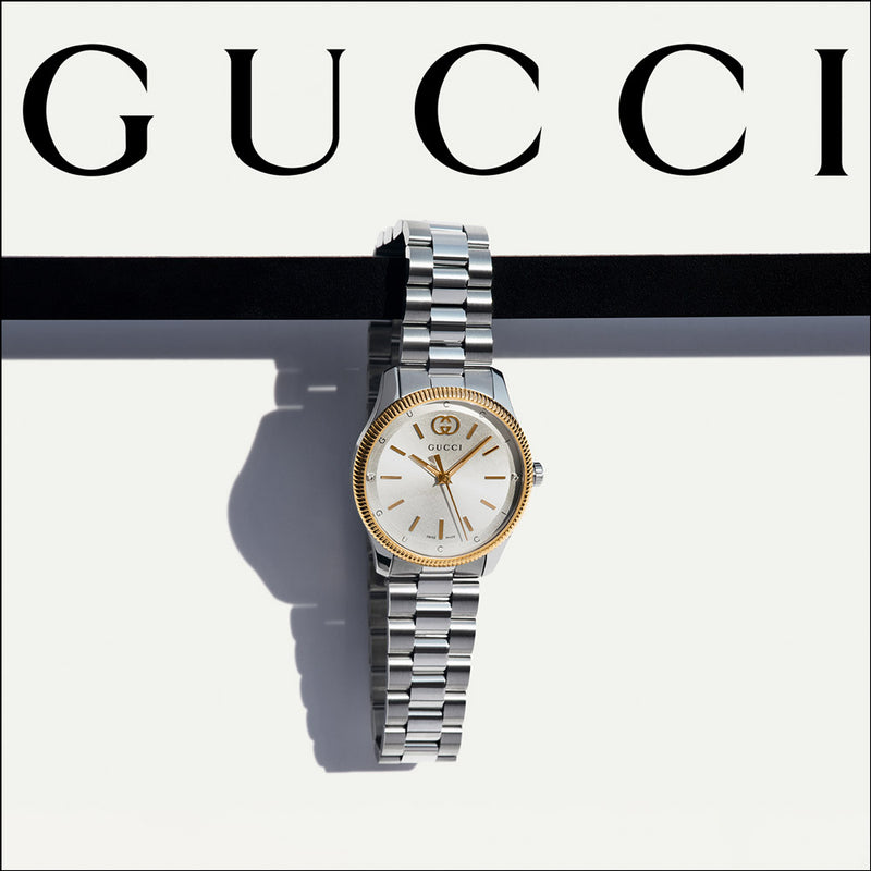 The House’s latest designs stay faithful to the classic timepiece's refined appeal with contemporary updates, including an elegant slimline silhouette. Unique ridged bezels, sleek dial finishes, and the subtle use of Gucci lettering and the Interlocking G motif characterize the new G-Timeless editions. An original three-link stainless steel bracelet completes the polished designs.