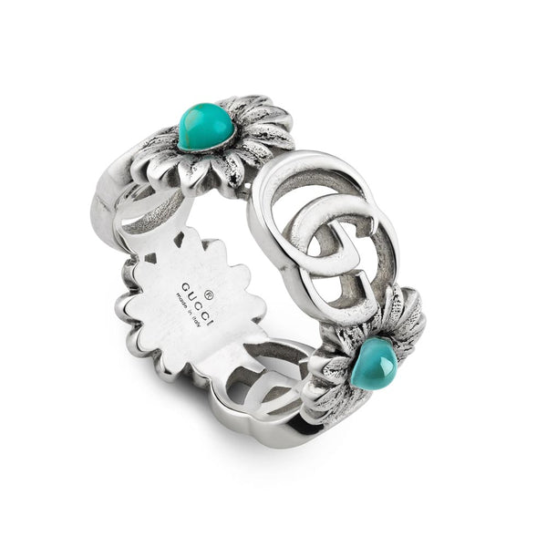 Revisited and reimagined by Alessandro Michele, the GG Marmont collection showcases an elegant line of sterling silver jewellery, both aged and polished to suit different styles. Pieces from this suite incorporate the double G – an exclusive symbol of the House, floral designs, and colourful gemstones.