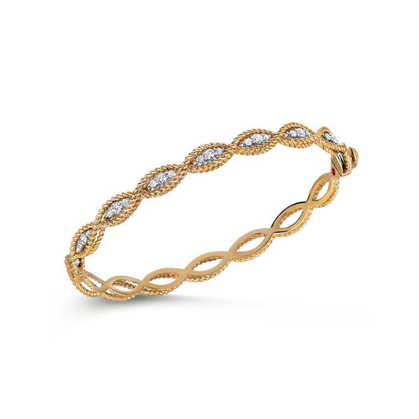 The New Barocco collection is a contemporary reimagination of the classic Roman Barocco range. The core structure of the design with tiny, intertwined gold wires have been redefined to offer a new aesthetic look that catches the light differently to highlight bright and shadowed areas of gold amongst sparkling diamonds.