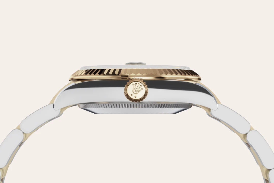 The Rolex fluted bezel is a mark of distinction. Originally, the fluting of the Oyster bezel had a functional purpose: it served to screw the bezel onto the case helping to ensure the waterproofness of the watch. It was therefore identical to the fluting on the case back, which was also screwed onto the case for waterproofness, using specific Rolex tools. Over time, the fluting became an aesthetic element, a genuine Rolex signature feature. Today the fluted bezel is a mark of distinction, in gold on this Datejust 31.
