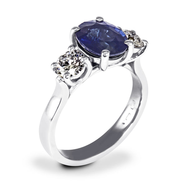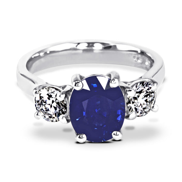 Platinum 2.87ct Oval Cut Blue Sapphire And 0.93ct Crescent Diamond Three Stone Ring