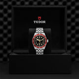 This 41mm, stainless steel TUDOR timepiece boasts a black dial with rose gold toned indexes and off-white Super-LumiNova hour markers and hands. The iconic 'snowflake' hand remains a bold and recognisable feature of this watch. Framing the dial is a steel 60-minute unidirectional bezel with burgundy aluminium insert. At the heart of this timepiece is a self-winding mechanical movement with bidirectional rotor system, Manufacture Calibre MT5602-U (COSC), with a power reserve of 70 hours. Finally, it is fitted with a five-link stainless steel bracelet in polished and satin finish with a TUDOR "T-fit" clasp.