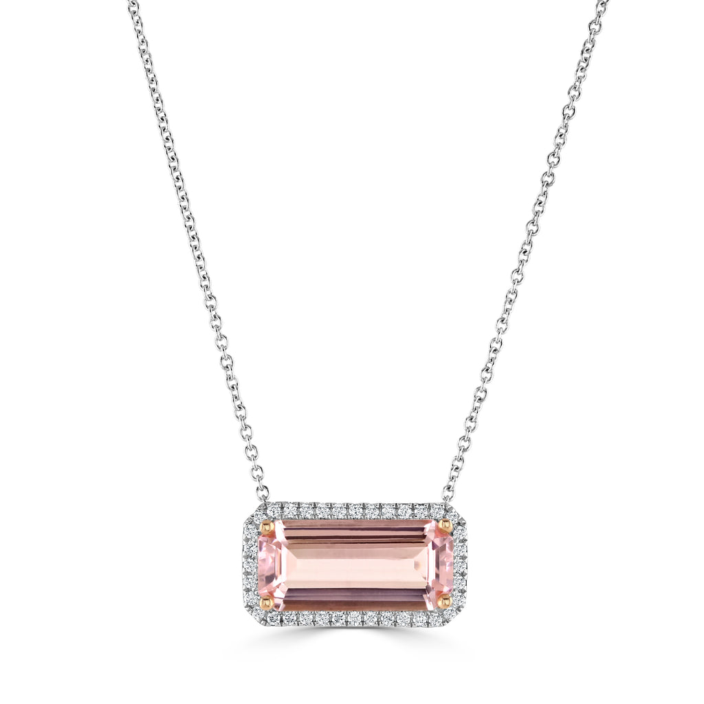 This stunning morganite and diamond adjustable necklace is exquisitely crafted in beautiful 18ct white and rose gold. The 1.00ct octagon cut morganite is perfectly framed by a dazzling halo diamonds with a total carat weight of 0.13ct.