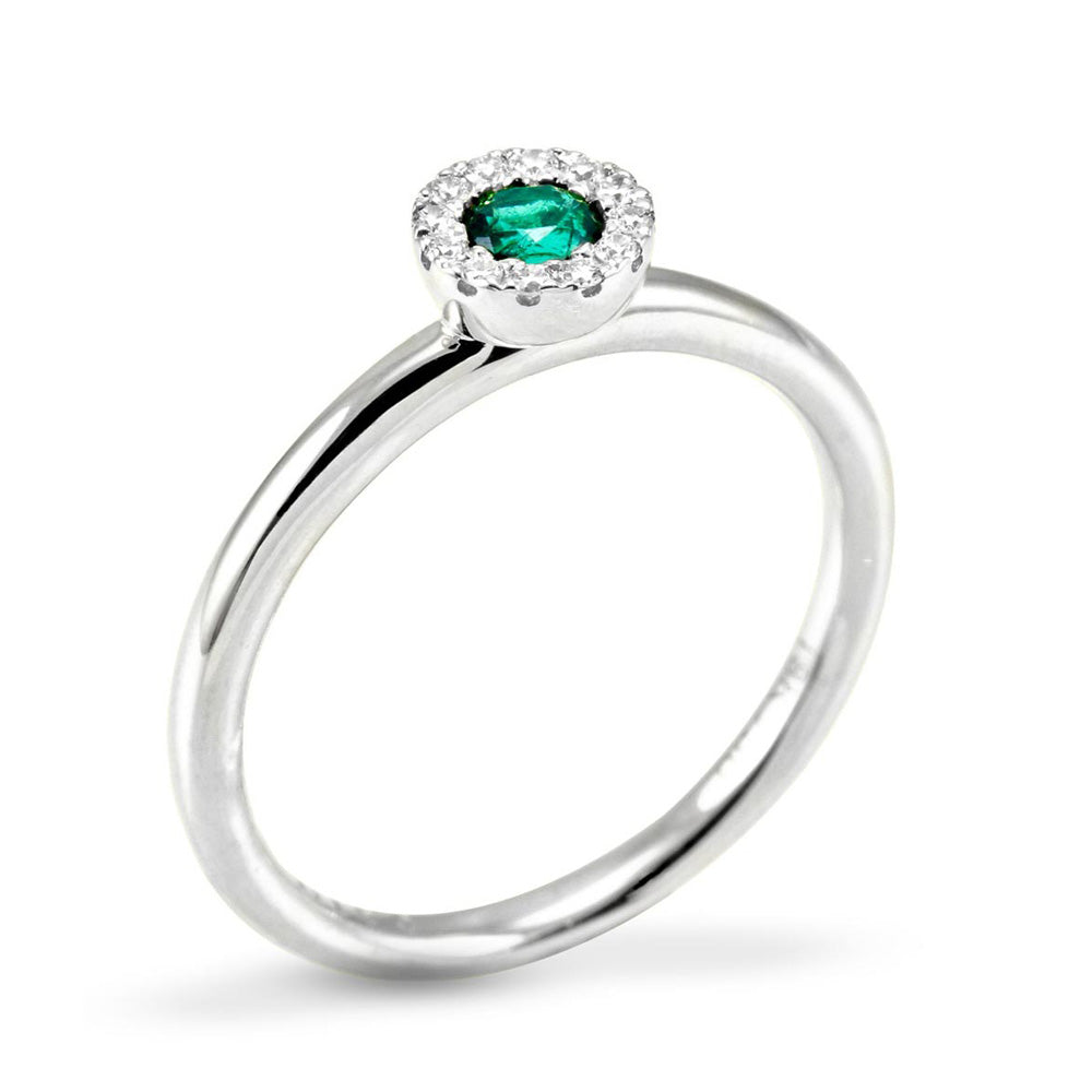 This beautiful emerald and diamond ring has been beautifully crafted in 18ct white gold. This ring adorns a stunning 0.16ct round brilliant cut emerald and has been set in a classic halo of dazzling round brilliant cut diamonds with a total carat weight of 0.07ct.