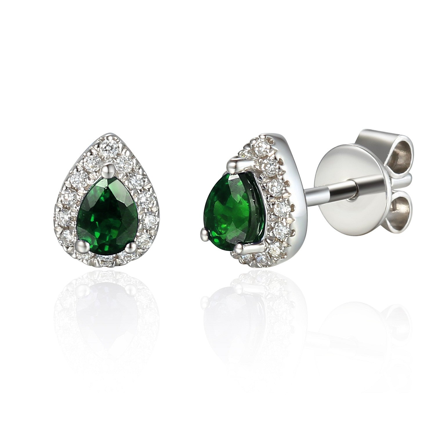 These elegant emerald and diamond stud earrings are a beautifully timeless design, exquisitely crafted in 18ct white gold. The stunning pear cut emeralds have a total carat weight of 0.30ct, and are perfectly framed by a dazzling halo of round brilliant cut diamonds with a total carat weight of 0.09ct.