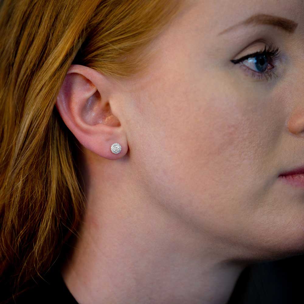 These stunning cluster stud earrings are beautifully crafted in 18ct White Gold, centered by two gorgeous bezel set round brilliant cut diamonds totaling 0.35ct and then surrounded by a halo of more dazzling round brilliant cut Diamonds. The perfect addition to any jewellery collection.