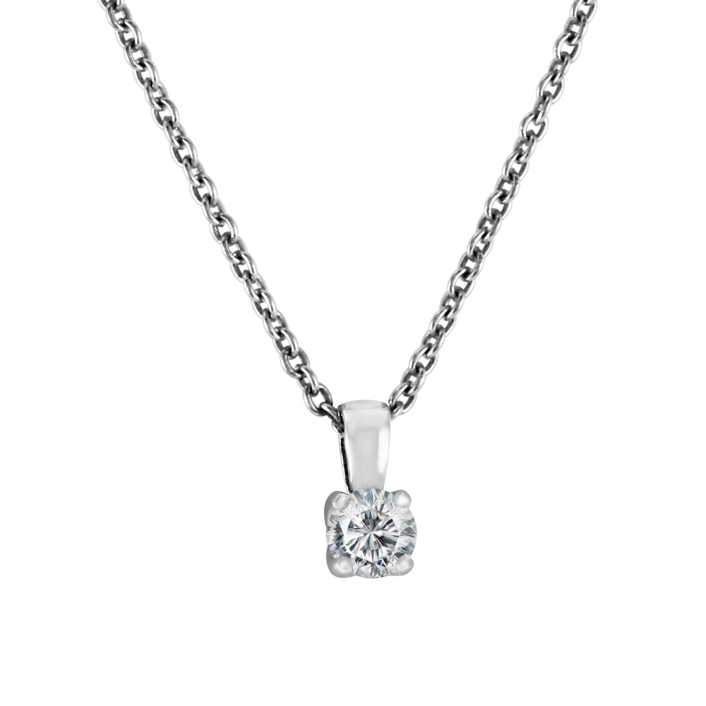 This simple, yet stunning diamond pendant is certainly a must have for your jewellery wardrobe! A single dazzling round brilliant cut diamond sits securely in an 18ct White Gold four claw setting to sparkle and shine for all to admire. The diamond is 0.35ct, G in colour, and SI clarity.