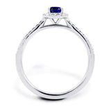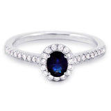 This 18ct white gold ring is set with a beautiful oval cut 0.50ct blue sapphire, and surrounded by a dazzling halo of round brilliant cut diamonds and stunning diamond-set shoulders. The total carat weight of diamonds is 0.19ct, G colour SI clarity.