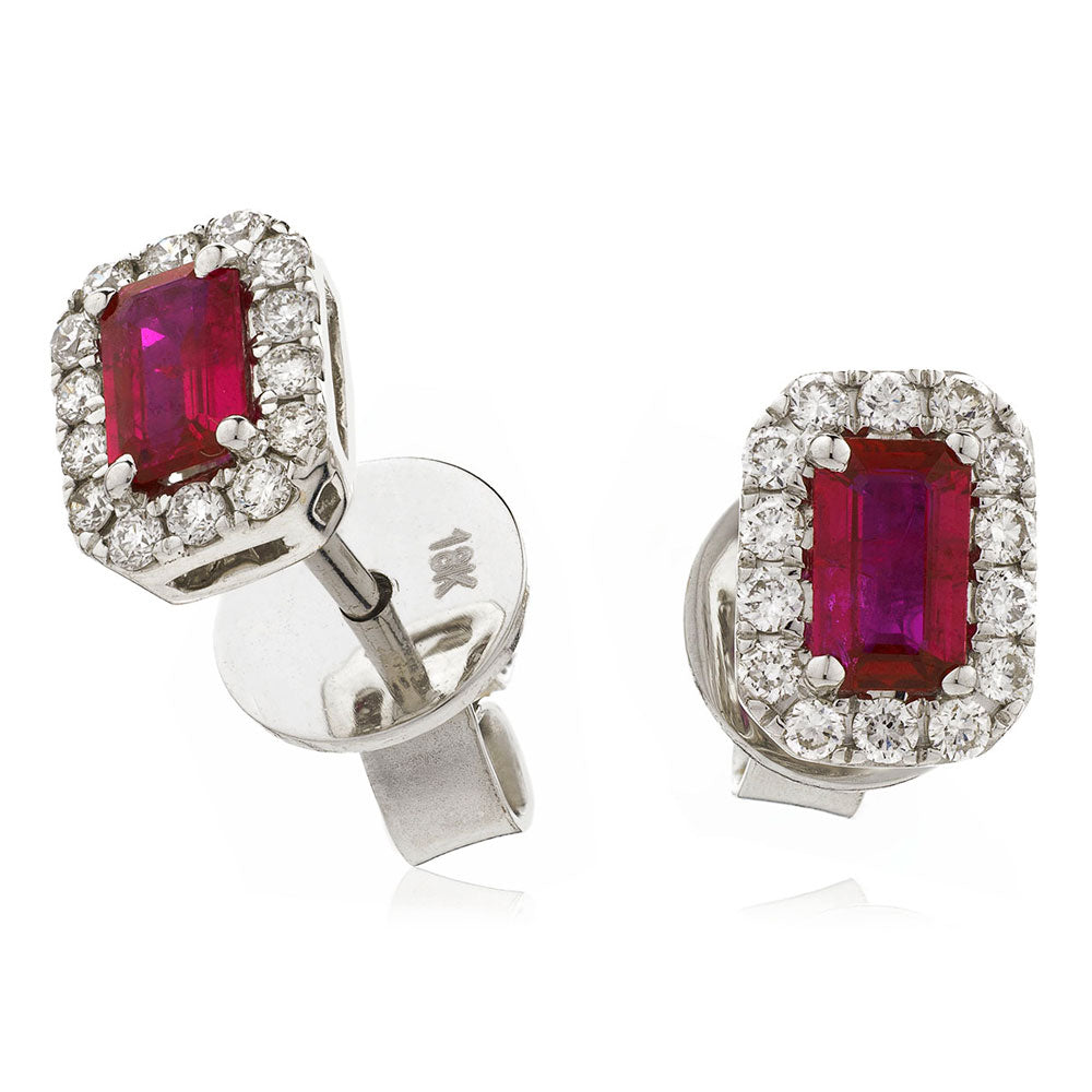 These stunning Ruby and Diamond earrings are simply an exquisite piece of jewellery and craftsmanship. Beautifully crafted in 18ct White Gold, these earrings adorn a 0.59ct emerald cut Ruby, surrounded by 0.26ct or dazzling round brilliant diamonds which really make the red of the ruby pop with colour! Ruby is the traditional July birthstone, is said to shield negativity, and is the stone of passion and love.