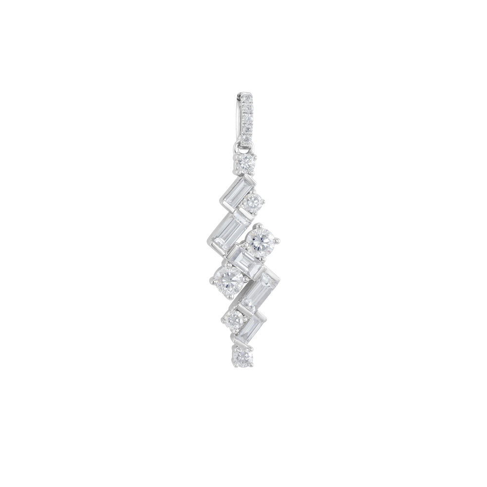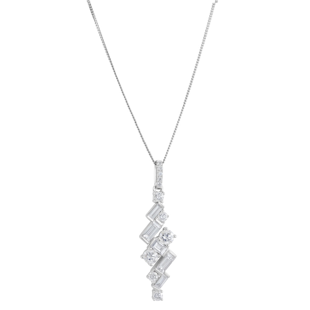 This striking pendant is expertly designed and hand crafted in beautiful 18ct white gold by highly skilled UK jewellers. The magnificent zig zag design consists of 5 beautiful baguette cut Diamonds, and 6 round brilliant cut Diamonds, with a Diamond bail to finish off this lovely design. The total carat weight of this pendant is 0.81ct, G colour, SI clarity.