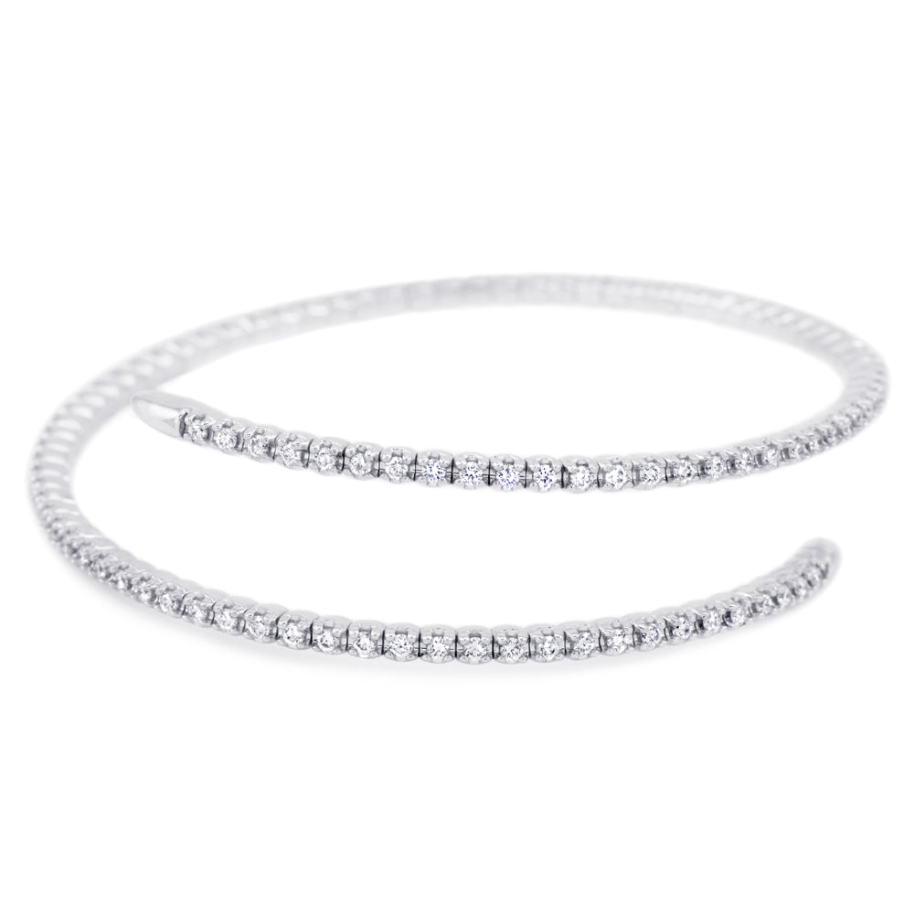 This exquisite flexible spiral bangle is beautifully crafted in 18ct White Gold, and adorns 1.30ct of dazzling round brilliant cut Diamonds, G in colour, SI clarity. The flexibility of this design allows the bangle to open and spiral around the wrist. Simply stunning!