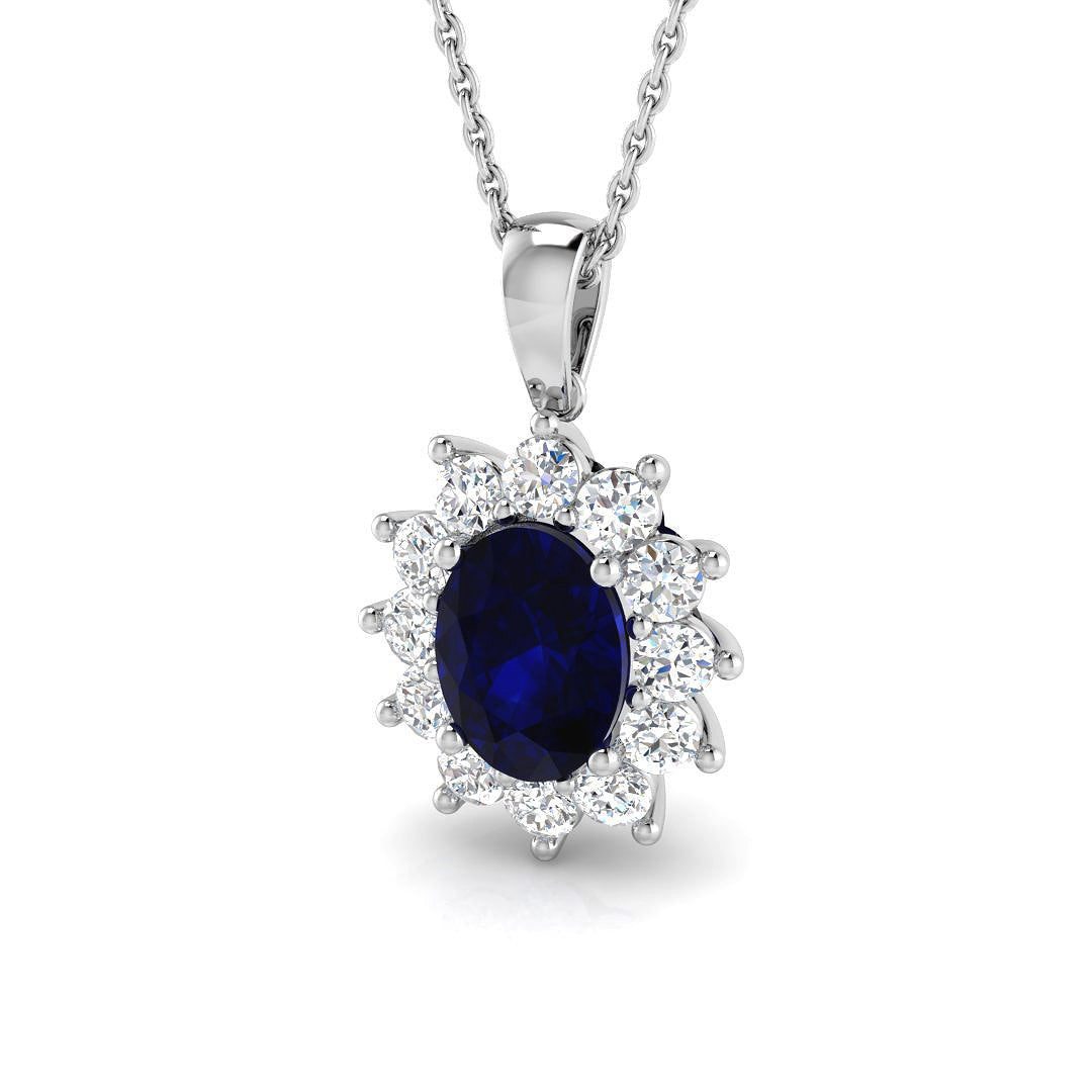 18ct White Gold 1.41ct Oval Cut Blue Sapphire And 0.54ct Round Brilliant Cut Diamond Cluster Necklace