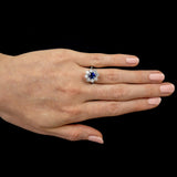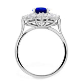 This gorgeous sapphire and diamond cluster ring is exquisitely crafted in 18ct white gold. The amazing 1.70ct oval cut blue sapphire has been beautifully set into a four claw setting and is surrounded by a beautiful cluster of round brilliant cut diamonds with a total carat weight of 1.65ct (8 diamonds). A real show-stopping ring!