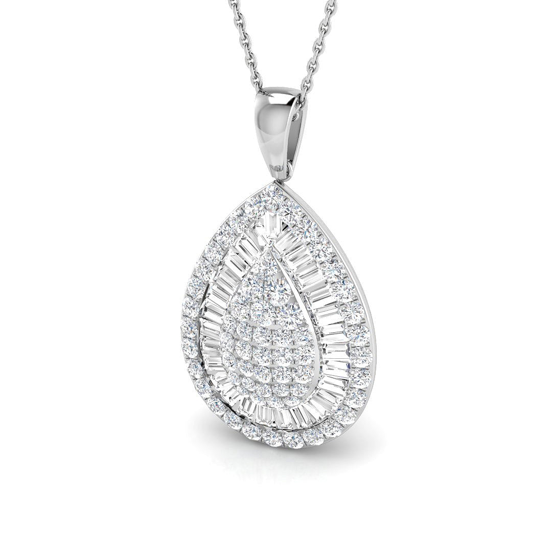 This gorgeous diamond necklace is beautifully crafted in 18ct white gold and adorns dazzling round brilliant and baguette cut diamonds set in a perfect pear shape, all with a total carat weight of 1.86ct. The pendant is suspended beautifully from an 18ct white gold chain.