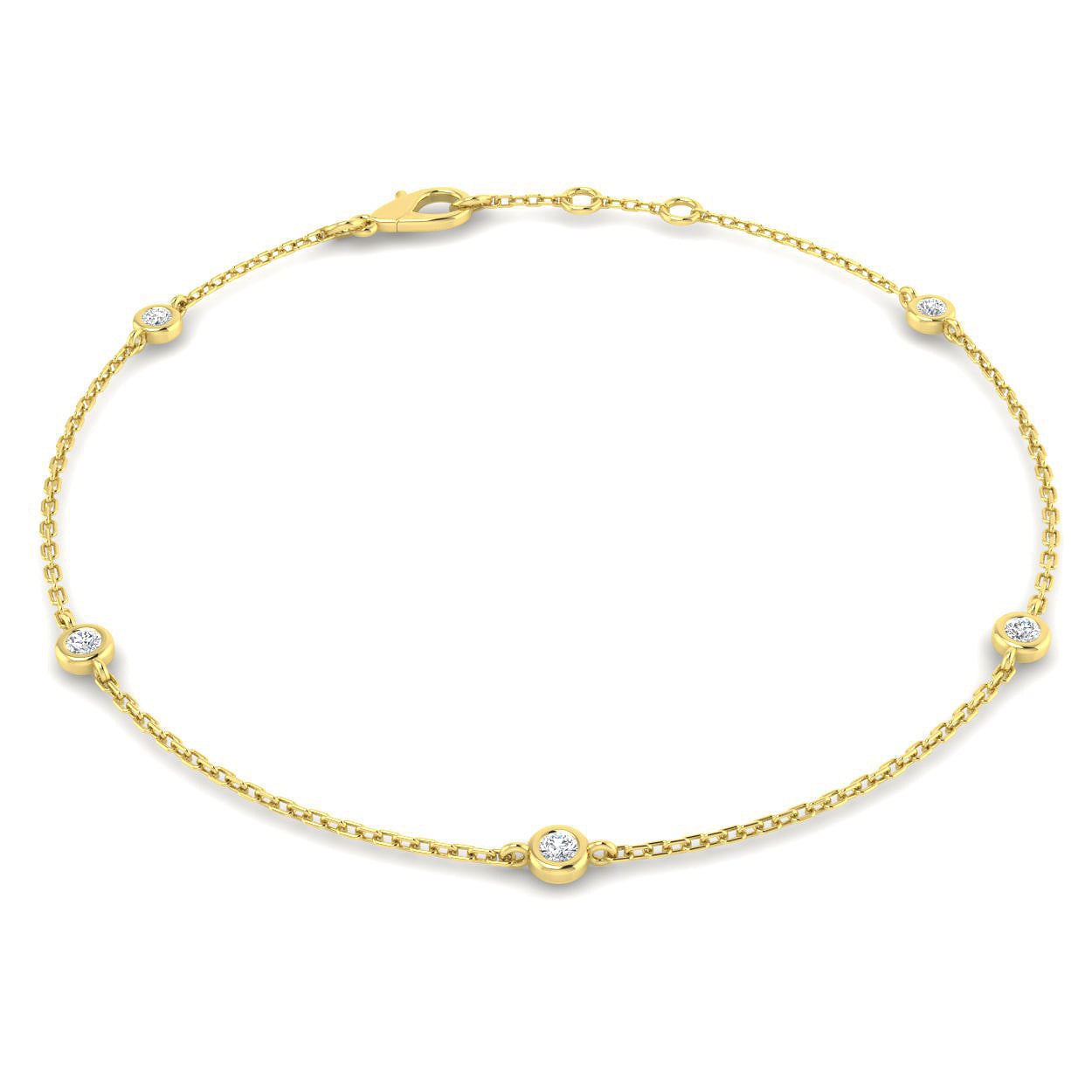 This stunning 18ct yellow gold diamond bracelet features 0.13ct of dazzling round brilliant cut diamonds stationed at intervals along the chain. Each diamond is secured in a bezel setting.
