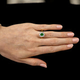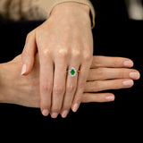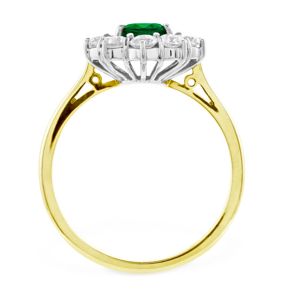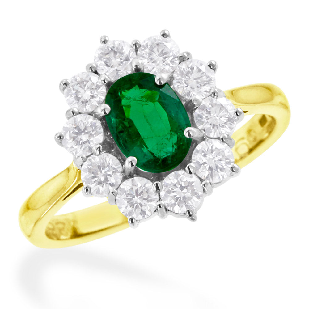 This gorgeous sapphire and diamond cluster ring is exquisitely crafted in 18ct yellow gold. The stunning 0.88ctct oval cut emerald has been beautifully set into an 18ct white gold four claw setting and is surrounded by a beautiful cluster of round brilliant cut diamonds with a total carat weight of 0.93ct (10 diamonds). A real show-stopping ring!