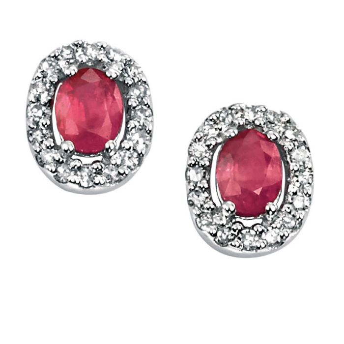 These beautiful stud earrings have been crafted in 9ct white gold, and are set with oval cut rubies which are surrounded by dazzling diamonds.