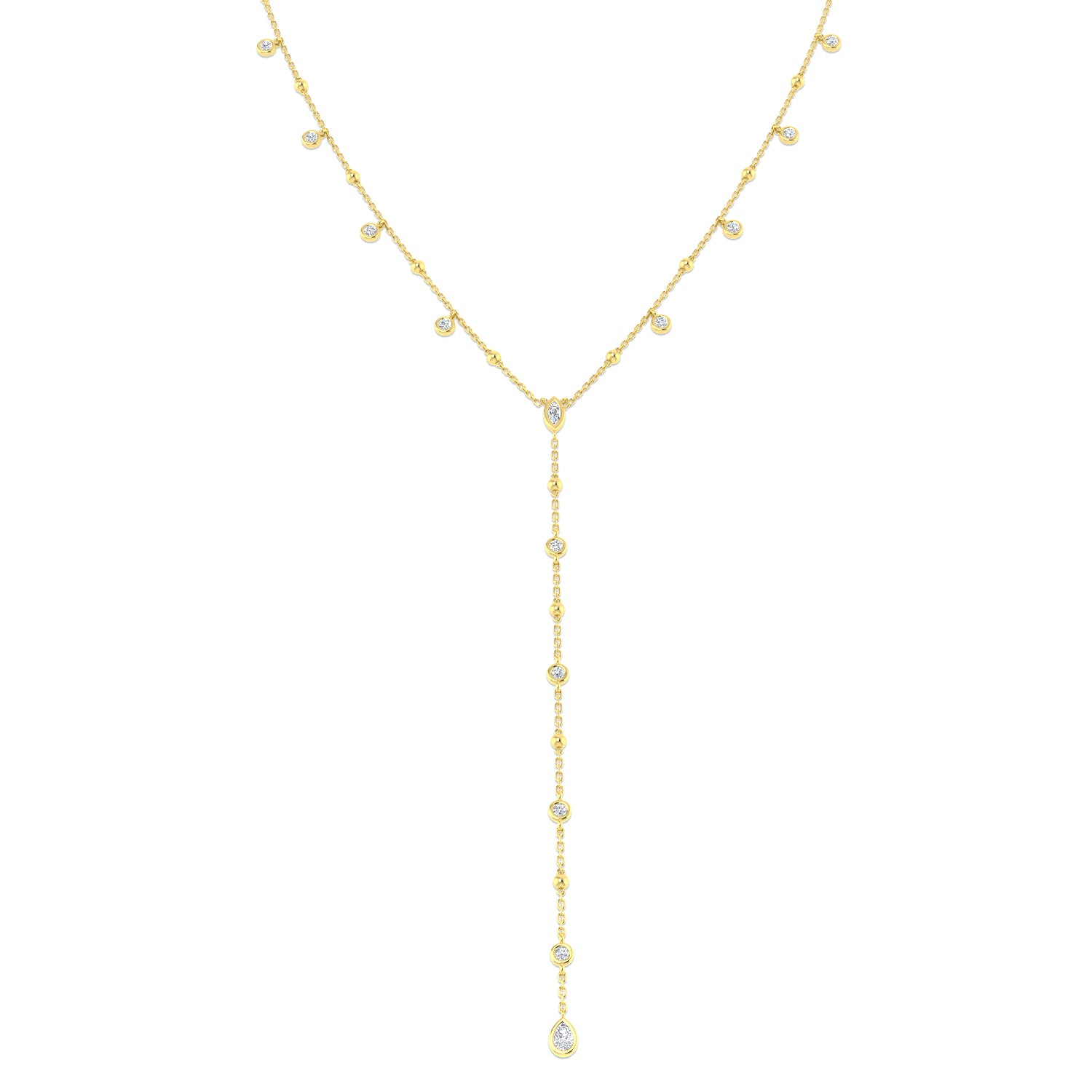 This stunning diamond drop necklace is exquisitely crafted in 9ct yellow gold. This necklace consists of dazzling round brilliant, marquise and pear cut diamonds stationed beautifully along the chain, all with a total carat weight of 0.58ct.