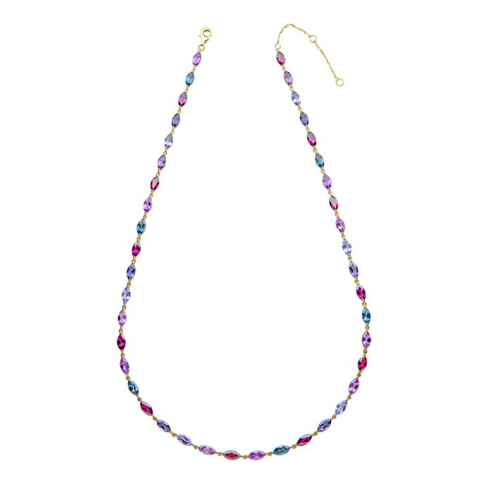 Crafted in beautiful 9ct yellow gold, this marquise cut necklace showcases tanzanite, amethyst, light amethyst, rhodolite, brazilian garnet, london blue topaz and iolite semi-precious stones, creating a gorgeous blend of colours.