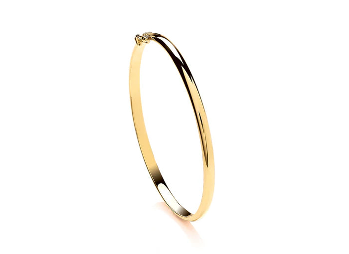 This bangle oozes classic sophistication. Made beautifully from 9ct yellow gold, this solid oval bangle, with hinged opening and figure of eight safety clasp, offers a classic touch to the wrist.