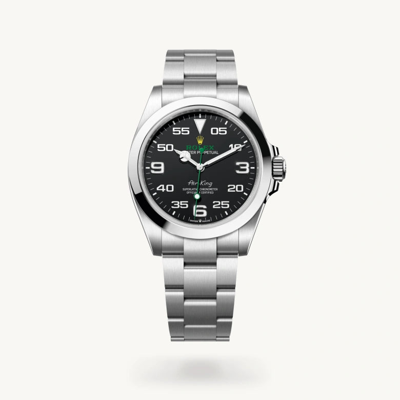 The Air-King dial features a distinctive black dial with a combination of large 3, 6 and 9 numerals marking the hours and a prominent minute scale for navigational time readings. It bears the name Air-King in the same lettering that was designed specially for the model in the 1950s.