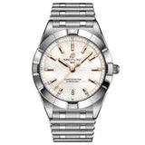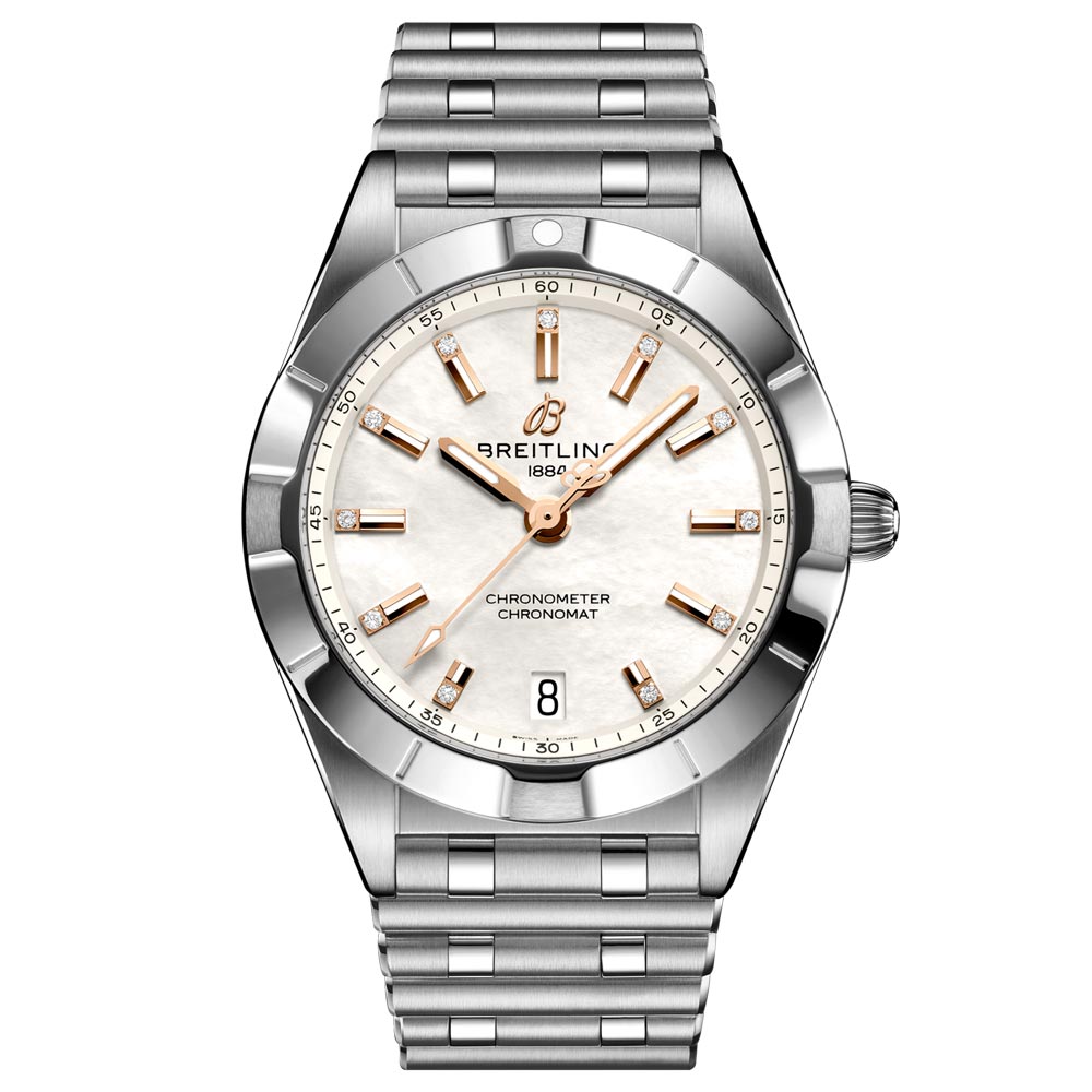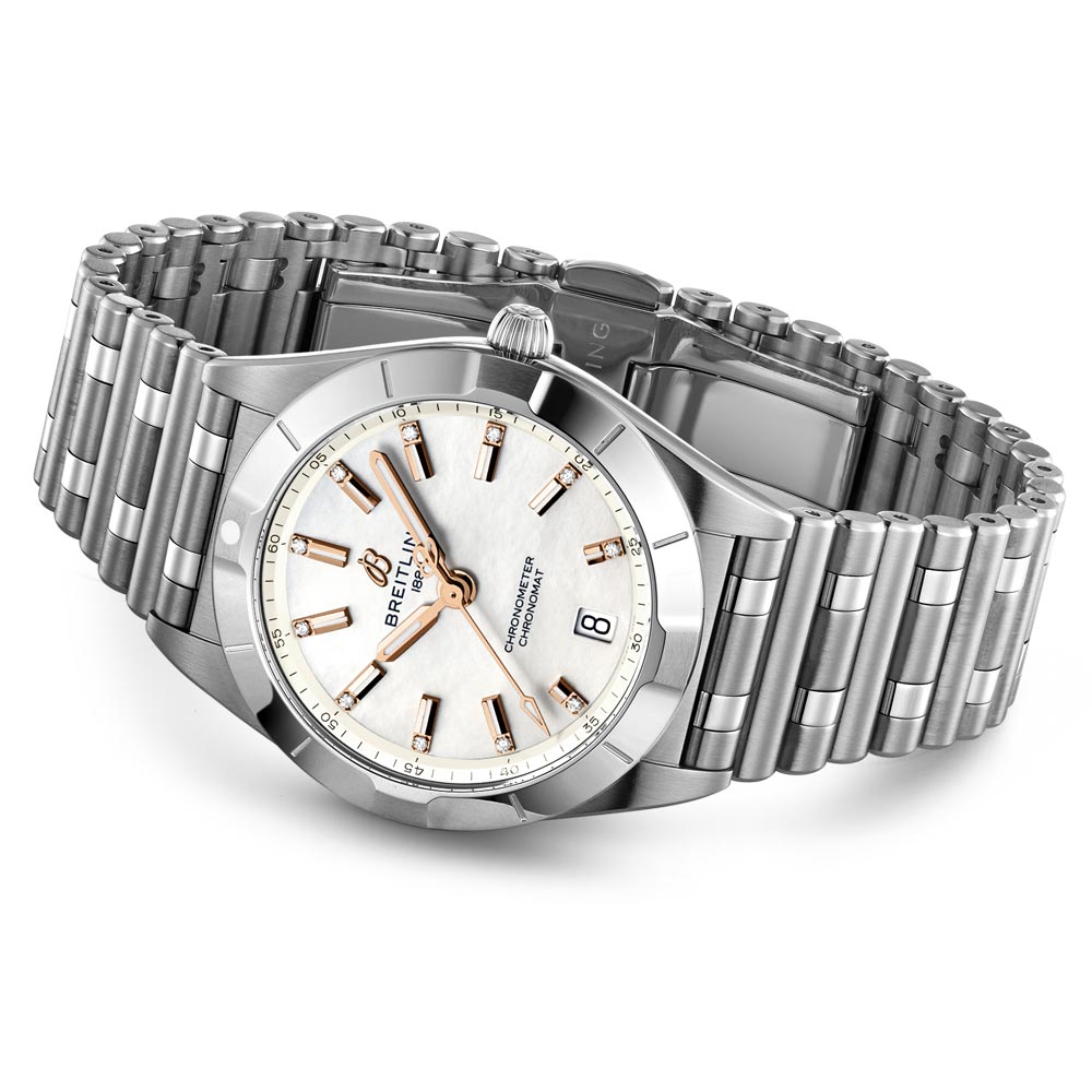 The Breitling Chronomat 32 is a modern-retro inspired watch that makes a stylish yet elegant statement, perfect for any occasion. The timepiece comes in a variety of metal cases, from stainless steel to bicolour and even 18ct red gold. Additionally, glitter-lovers can opt for diamond-set bezels, indices, and colorful dials. With the iconic and comfortable “Rouleaux” bracelet and a butterfly clasp, the Chronomat 32 is powered by the Breitling Calibre 77, a COSC-certified SuperQuartz™ chronometer.