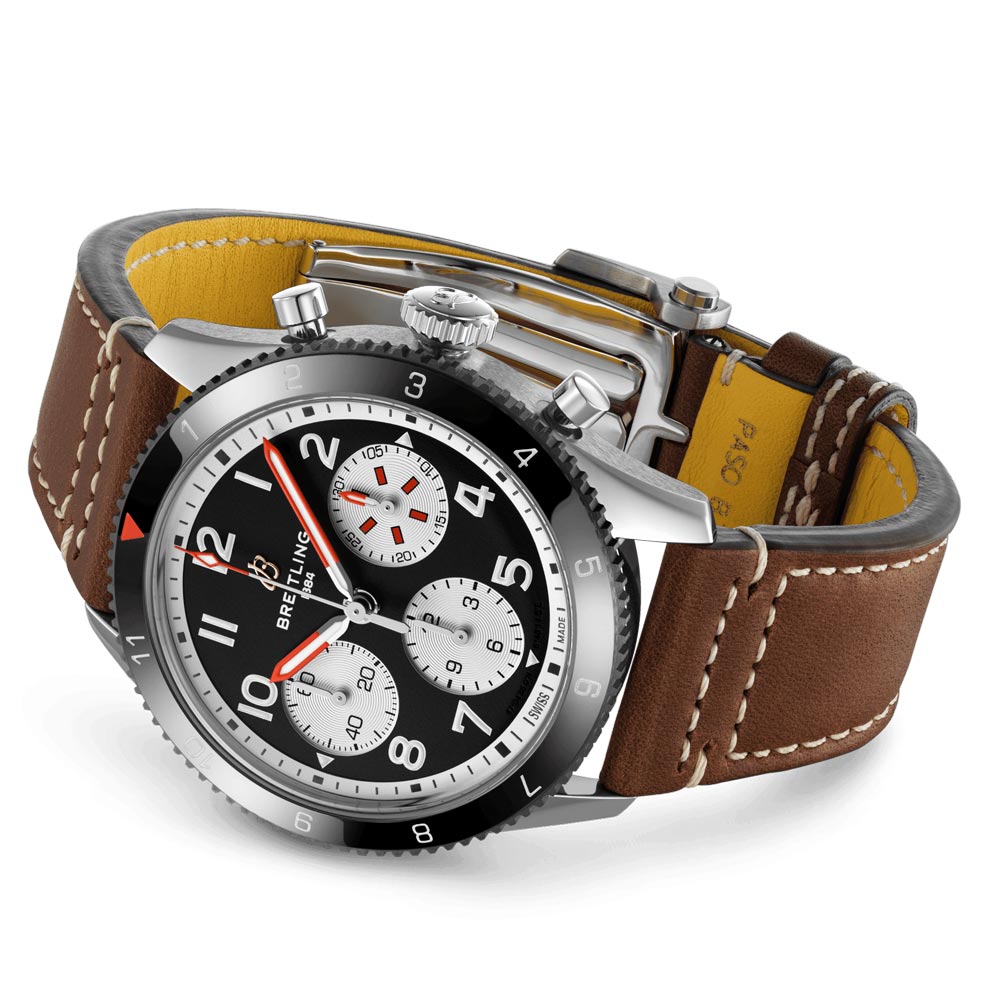 Designed with the rigors of a vintage cockpit in mind, the 42mm Classic AVI Mosquito boasts large and easy-to-read Arabic numerals on the dial and bezel. An ergonomic knurled bezel ensures maximum grip, even when wearing gloves. Timeless details like its top-stitched calfskin straps and stylish stainless-steel bracelet pay homage to aviation history. Accurate Breitling Calibre 23 movement provides a 48-hour power reserve, making it an ideal choice for pilots and other travellers.
