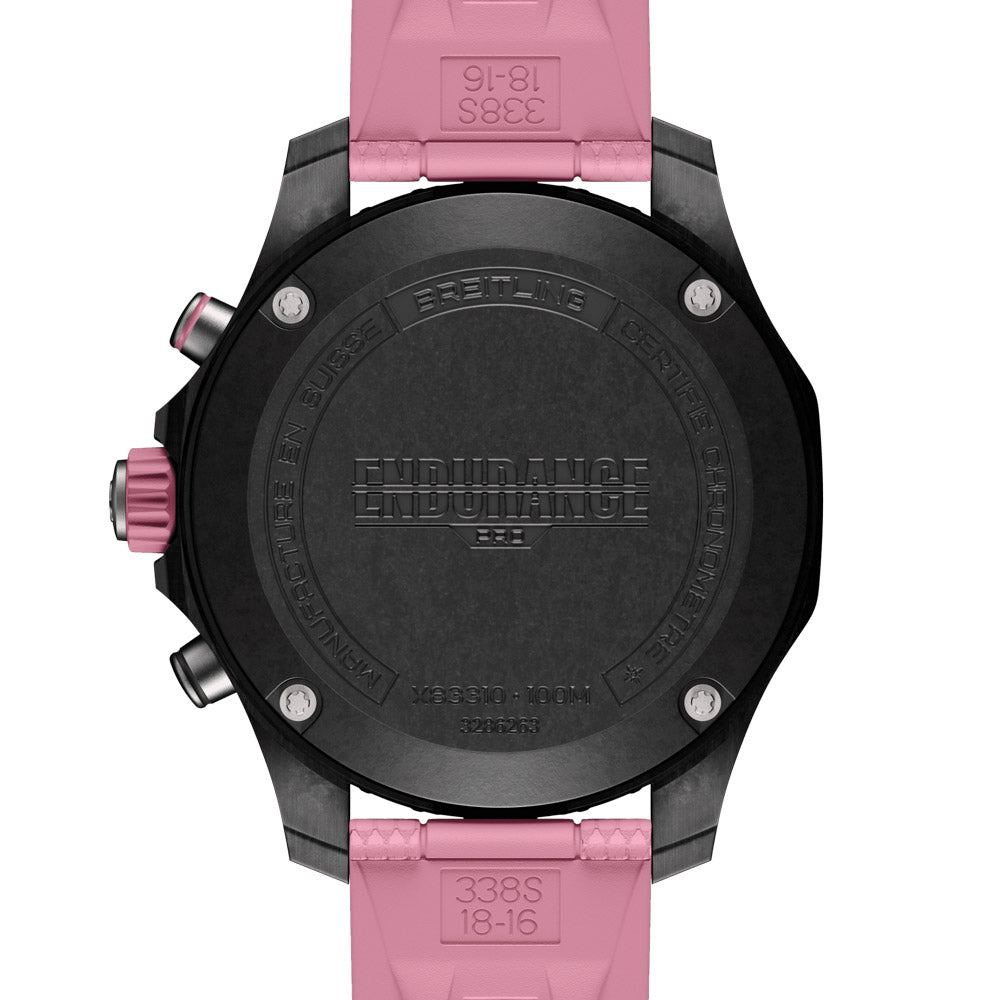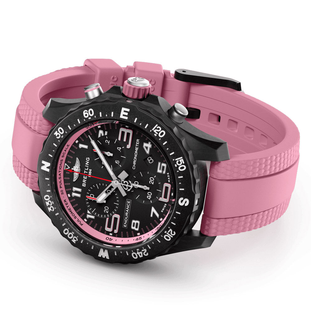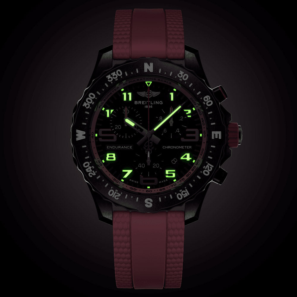 Crafted solely by Breitling, the material is a 100% product of Switzerland. With a choice of either 44 mm or 38 mm, the Endurance Pro comes in a variety of vibrant dials and rubber straps, all equipped with a Breitlight® tang-type buckle. Powering the different sizes are Breitling's Calibre 82 and 83, both COSC-certified SuperQuartz™ chronographs that offer unparalleled accuracy.