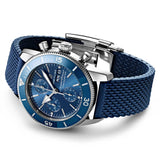 Available in stainless steel and 18ct red gold, the Superocean Heritage Chronograph 44 has a selection of colourful dials. This Superocean Heritage is equipped with either a matching mesh bracelet or "mesh-styled" rubber strap and folding buckle, and relies on the COSC-certified chronometer Breitling Calibre 13 for power.