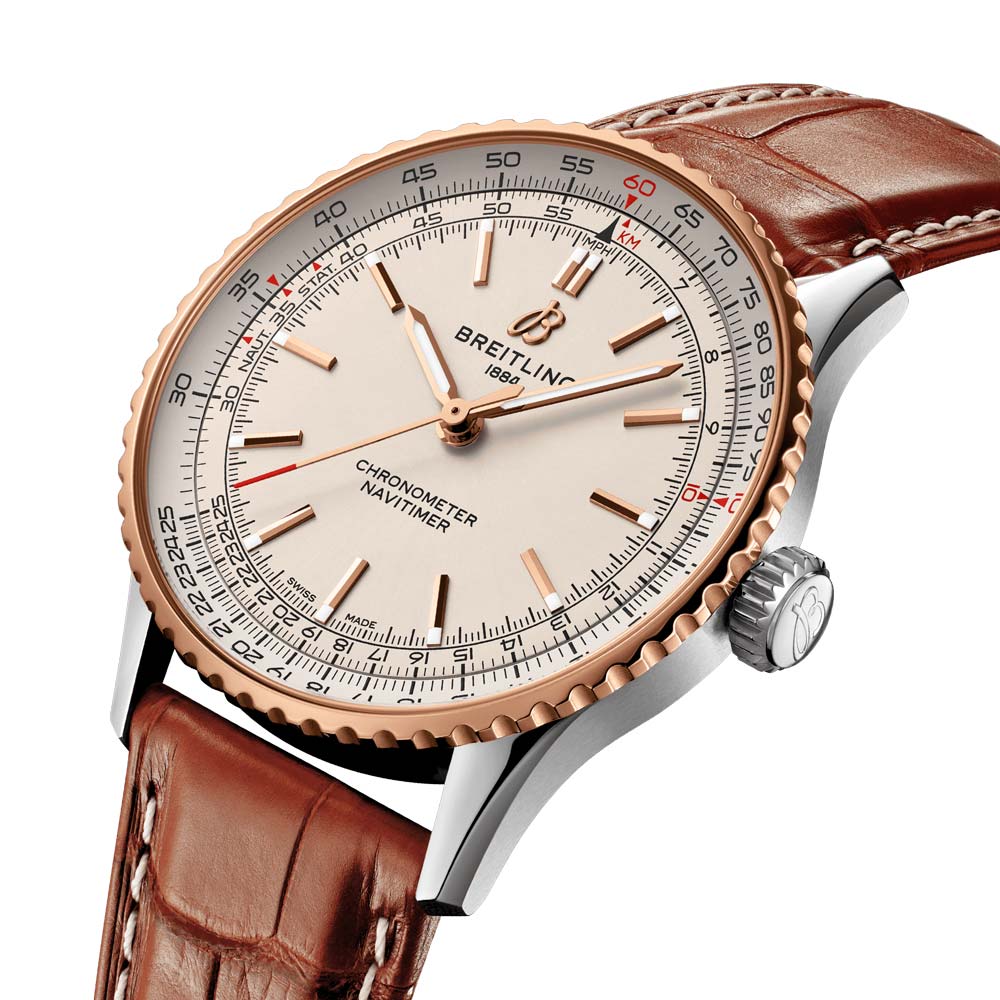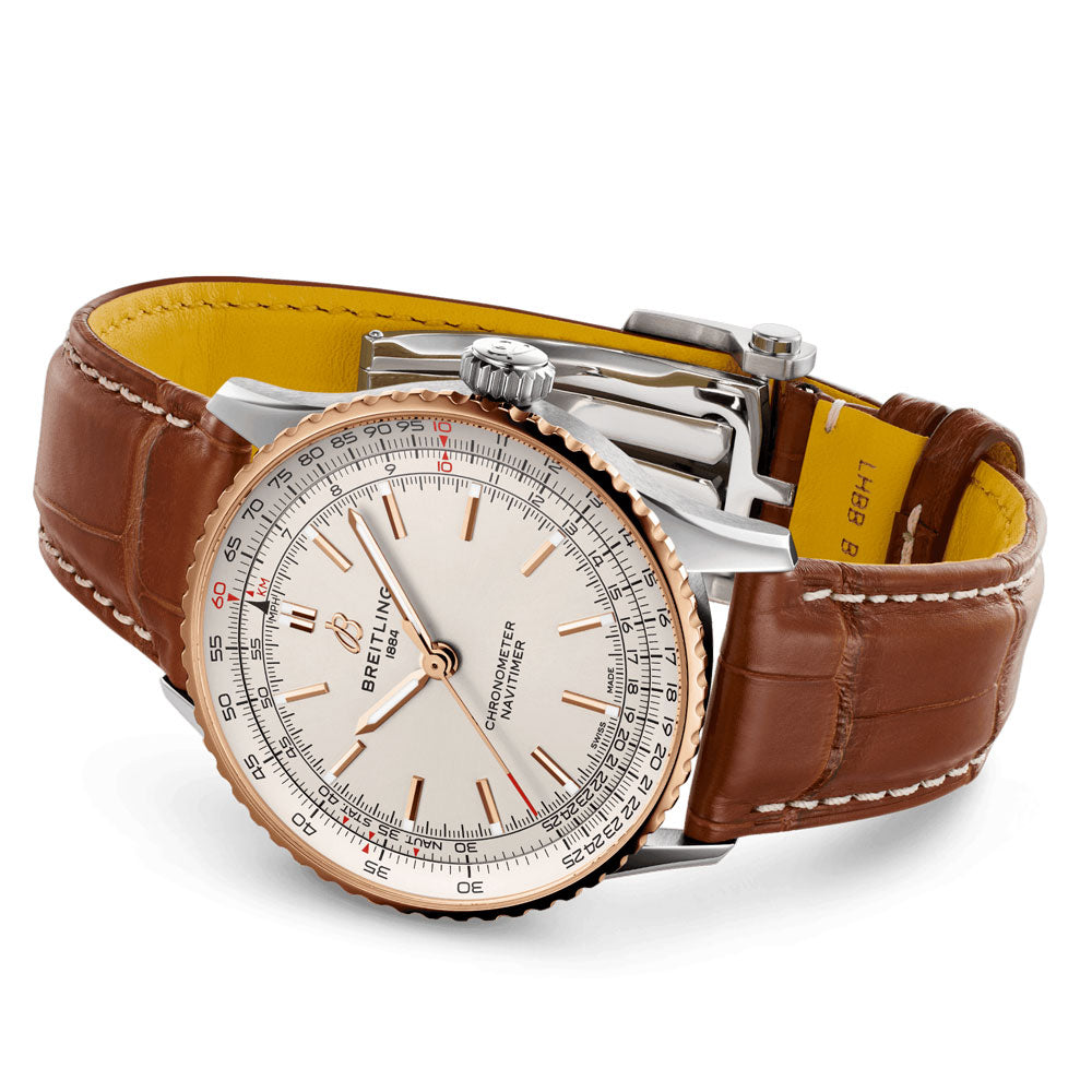 The inclusion of a notched bezel in the design adds a modern touch to the refined collection, while the combination of polished and brushed finishes creates an eye-catching play of light. Comfort and convenience are prioritized with the option of alligator leather straps and seamless butterfly clasps on bracelets. Choose from a selection of stainless steel or 18ct red gold cases, each featuring vibrant dials. This updated version of the Navitimer combines classic and contemporary elements, appealing to both enthusiasts and fashion-conscious individuals, showcasing Breitling's dedication to tradition and ingenuity in every timepiece.