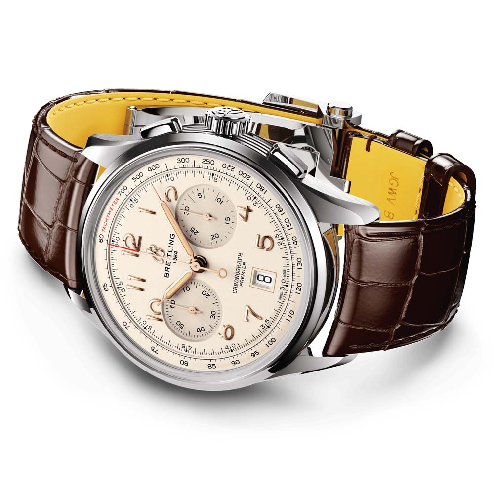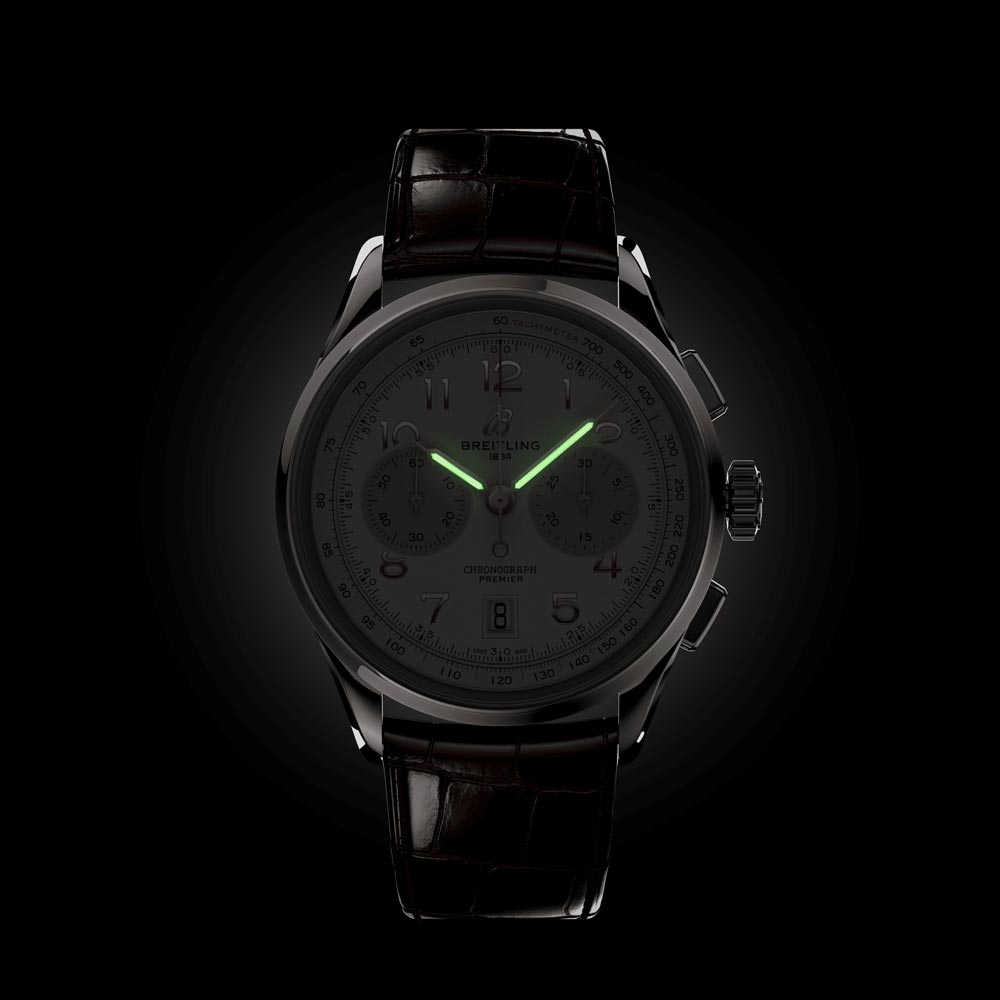 This regal Premier chronograph features a 42mm stainless steel case presented on a distinguished blue crocodile leather strap. Its deep blue dial is accentuated by striking black 30-minute and 12-hour chronograph counters. View the self-winding high-precision chronometer-certified chronograph calibre, Breitling Manufacture Calibre 01, through the transparent sapphire caseback. Five-year warranty included. Opt for a brown nubuck leather strap or a classic seven-row stainless steel bracelet for varying looks. A perfect amalgam of elegance and performance define the Breitling Premier name.