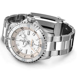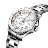 This Breitling Superocean 36mm White Dial Automatic Ladies watch celebrates the style of the 60s-era Slow Motion watch. It features a ceramic-inlayed bezel, bright dials, broad luminescent hands/indexes for readability underwater, and is water resistant to 300 m (1000 ft). It's also shock-, sand- and saltwater-resistant, ideal for all your water-based activities. A timeless classic in both performance and style.