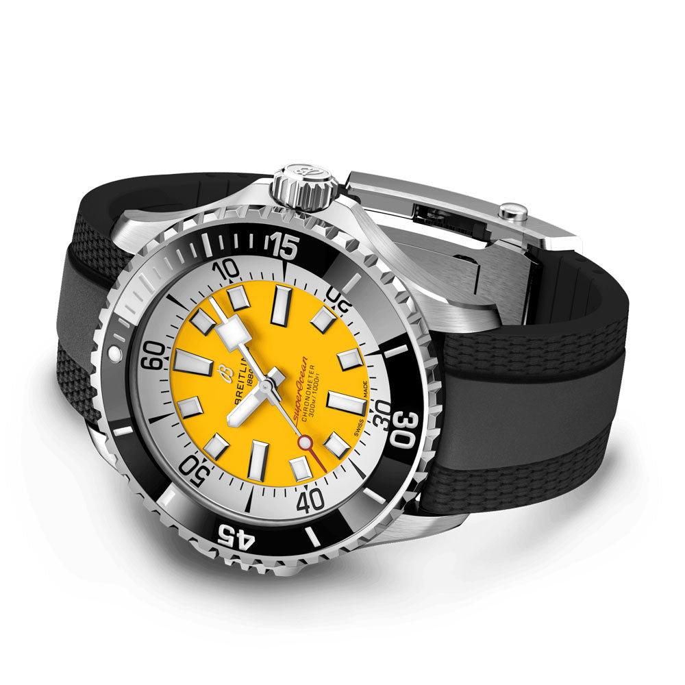 The Breitling Superocean gents watch, with its yellow dial and 46mm size, combines both high performance and stylish design for all aquatic activities. During the scuba diving craze of the 1960s, Breitling focused on creating a dive watch that prioritized timing and essential features for lifesaving. The result was the Slow Motion, a streamlined watch with clear lines, luminescent indexes, squared-off hands, and a high-contrast dial ring for optimal legibility. While its practicality was appreciated, it was the watch's sleek appearance that truly captured people's hearts.