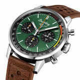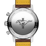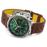 Perfect for families and sporty folks alike, it was the embodiment of "cool," seen in many iconic films and still in production today. This 42mm stainless steel model features a brown calfskin leather strap with a green dial adorned with yellow and orange and Ford Mustang pony logo. It is driven by the COSC certified Breitling Calibre 25 for 1/8th second precision.