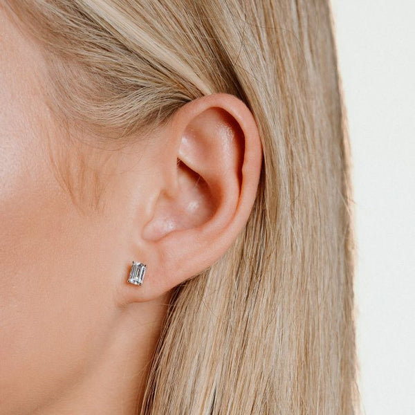 These stunning stud earrings features princess cut cubic zirconia stones, perfect for making a dazzling statement. The stones are set in sterling silver that also has a protective three-layer plating.