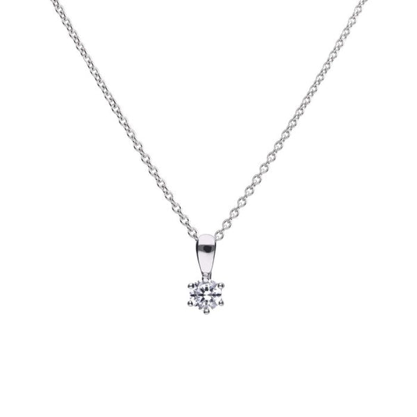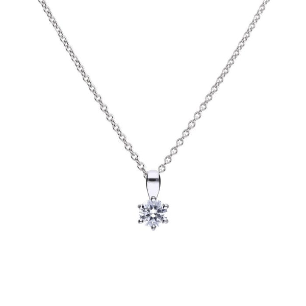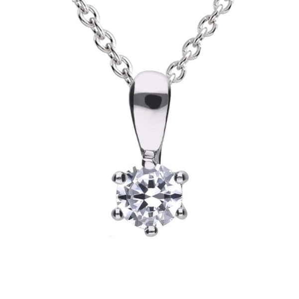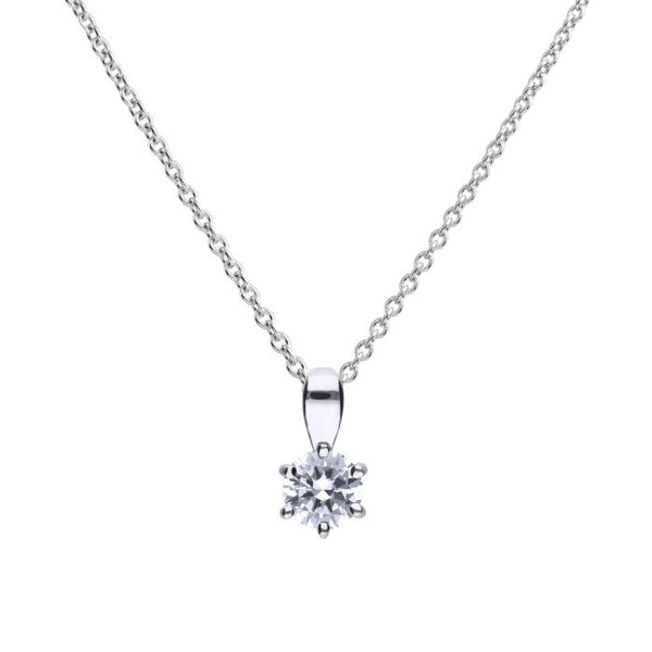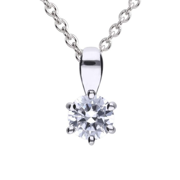This beautiful necklace features a single 1.00ct solitaire cubic zirconia stone, this stone has 57 facets like a real brilliant cut diamond, perfect for making a dazzling statement. The stone is set in a six claw setting, and in sterling silver that also has a protective three-layer plating. This captivating necklace is adjustable from 43cm to 45cm.