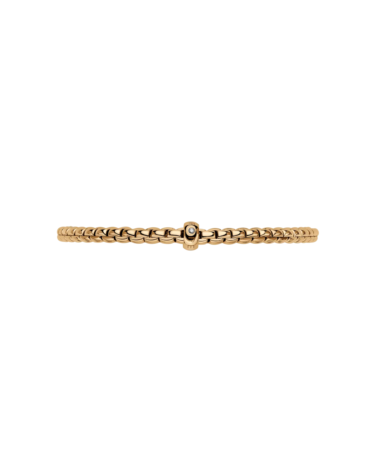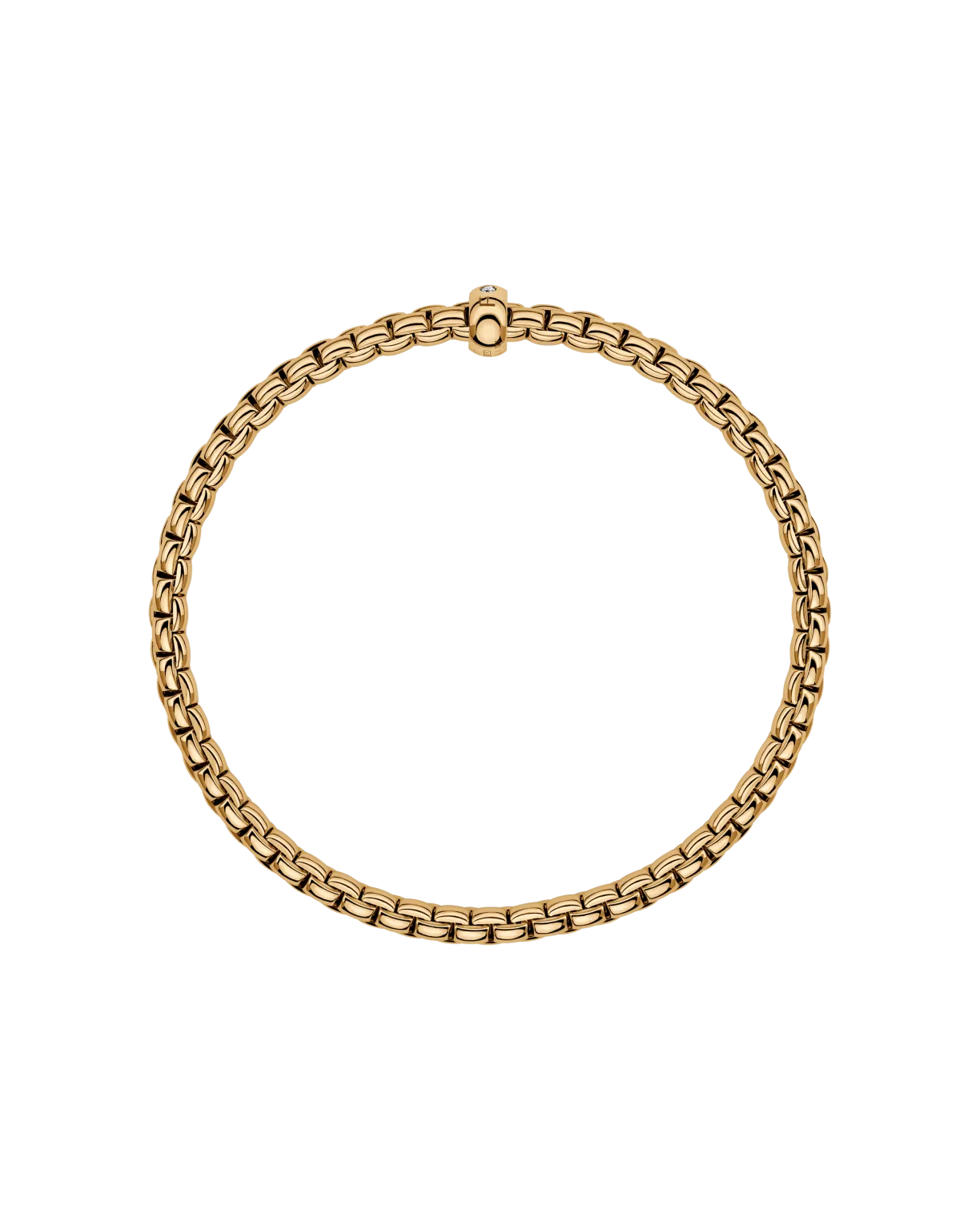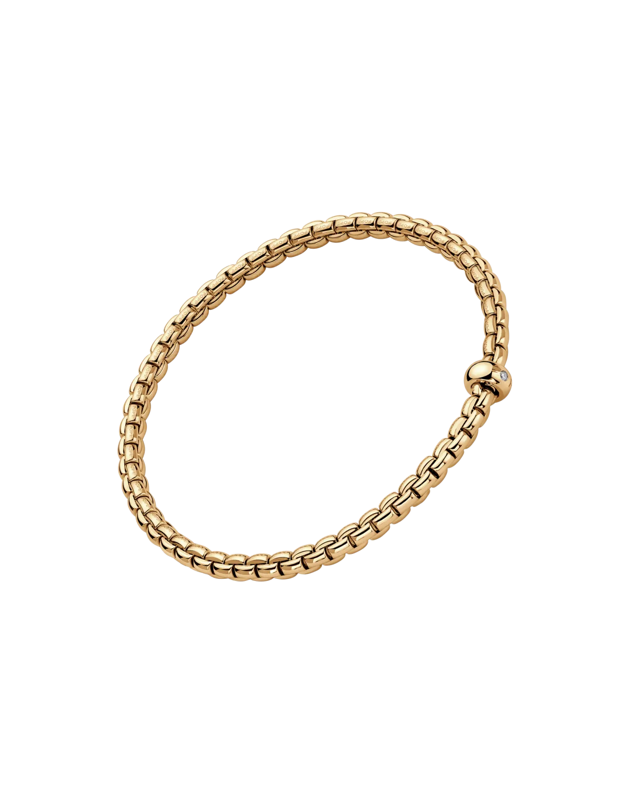 This beautiful FOPE bracelet from the Eka collection is exquisitely crafted from the finest 18ct yellow gold by master goldsmiths at FOPE's dedicated workshop in Vicenza, Italy. The single gold rondel is embellished with a dazzling round brilliant cut diamond that takes the place of the 'O' in FOPE, to add a touch of sparkle to the design.