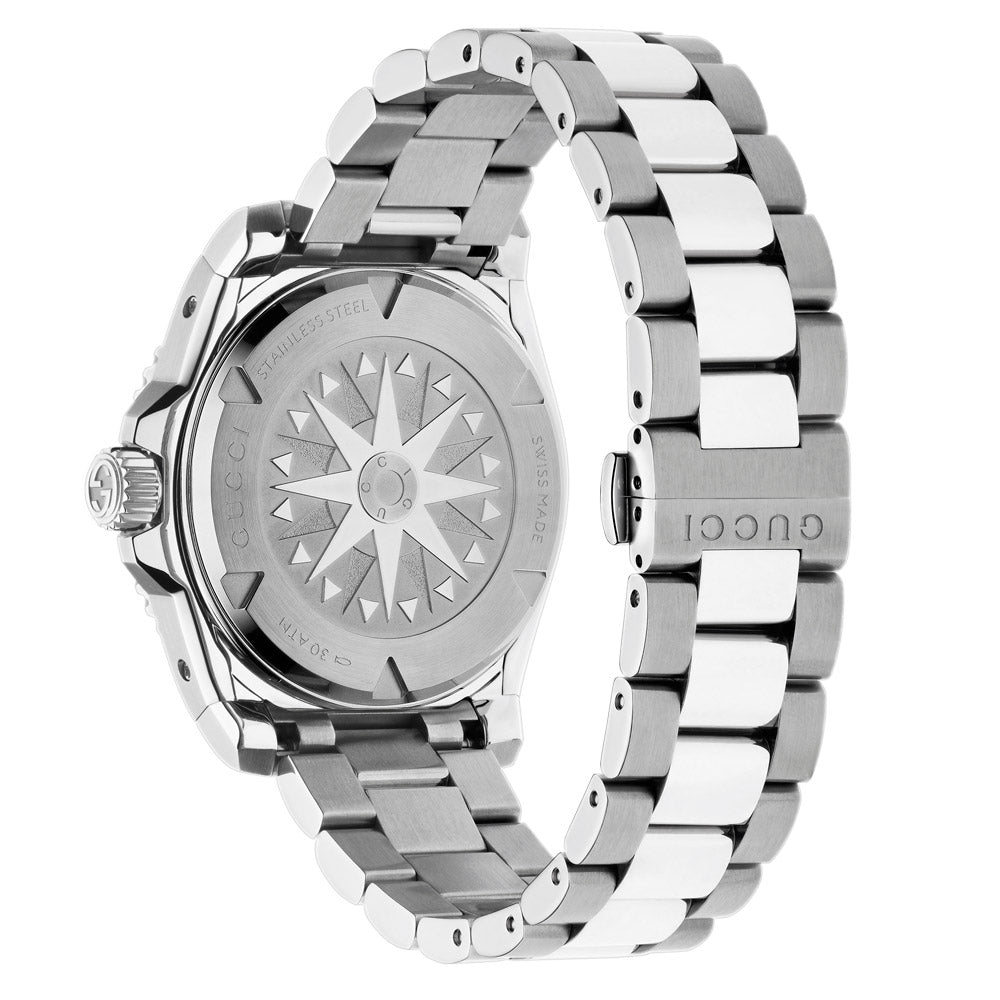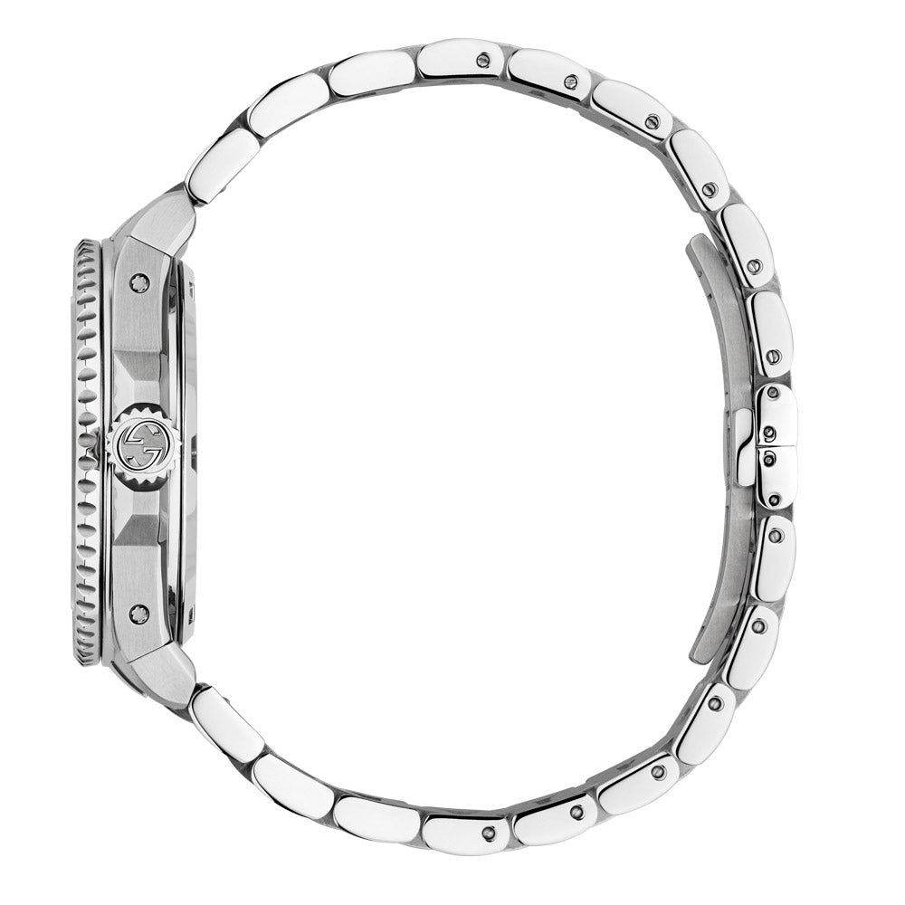 The Gucci Dive series showcases modern interpretations of traditional House symbols. With a steel case and stainless steel bracelet, this watch stands out for its green dial and signature Interlocking G logo.