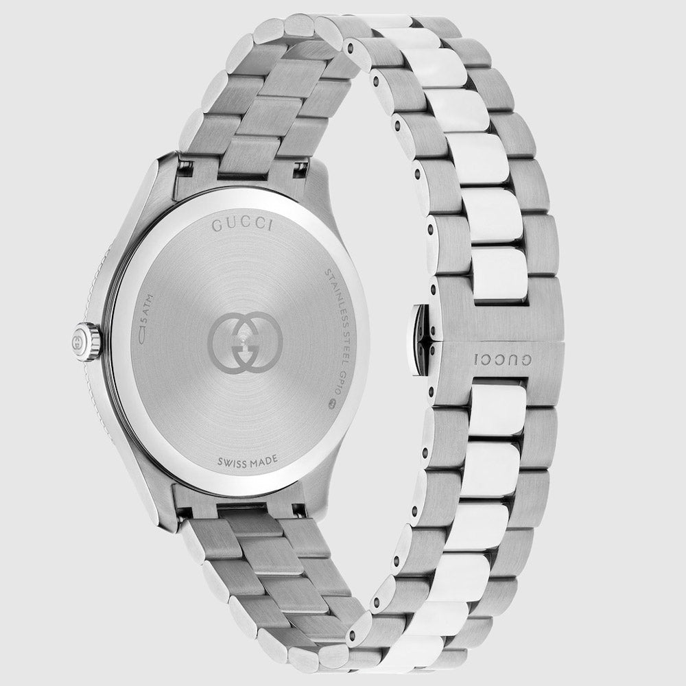 Enhance your collection with the latest G-Timeless line, showcasing signature House motifs. This stunning accessory boasts a quartz movement and a stainless steel bracelet complemented by a silver-toned dial. Elevate your style with the iconic Interlocking G logo.