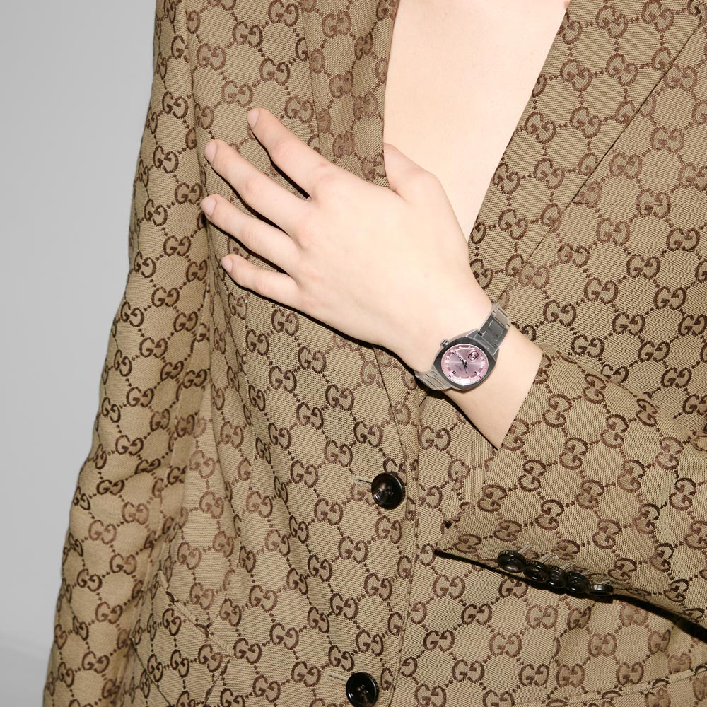 The Gucci Interlocking watch features a quartz movement that seamlessly blends the brand's traditional elements with a modern aesthetic. Its 29mm case boasts a pink dial adorned with diamonds and is complemented by a stainless steel bracelet. The iconic Interlocking G logo is prominently displayed on the small seconds counter.