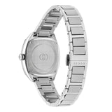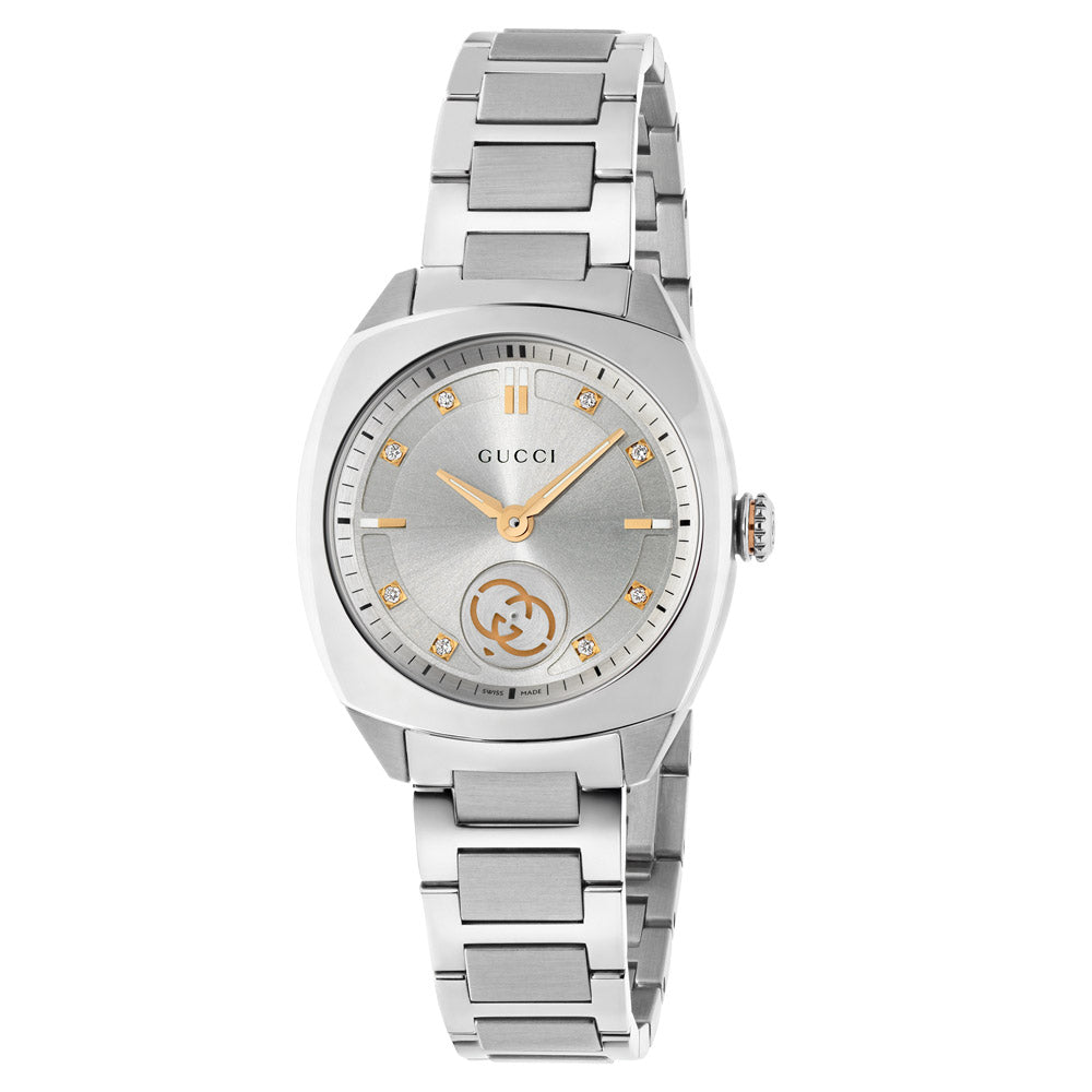 - 29 mm stainless steel case, silver dial with diamonds and Interlocking G and Gucci lettering, stainless steel bracelet