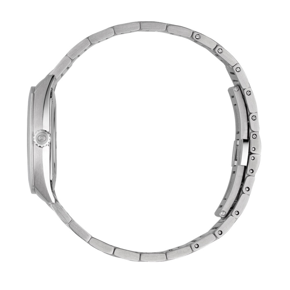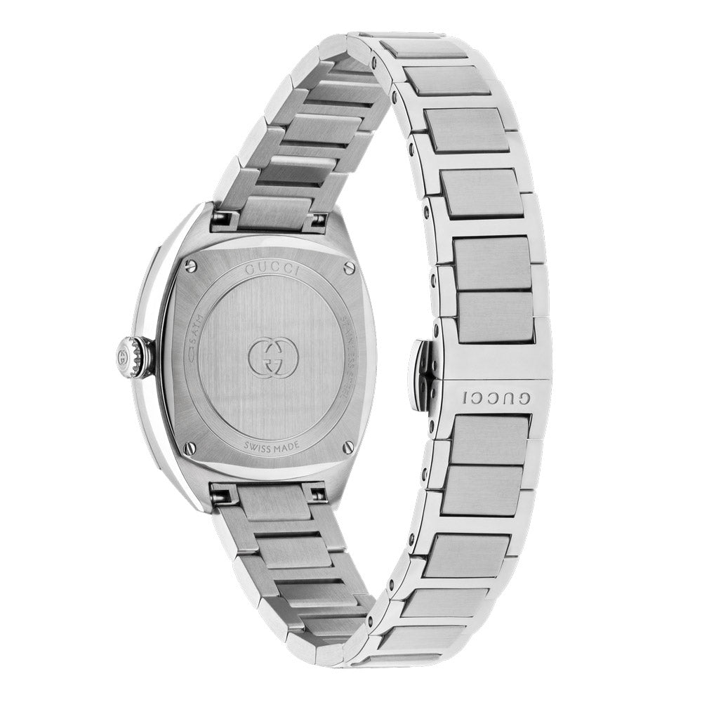 Featuring a timeless and refined design that pays homage to Gucci's illustrious history, the Interlocking G collection combines elements of sport and leisure. Adorned with the iconic symbols of the brand, including the Interlocking G design on the mini seconds dial, this watch exudes a sophisticated allure with its sleek steel bracelet.