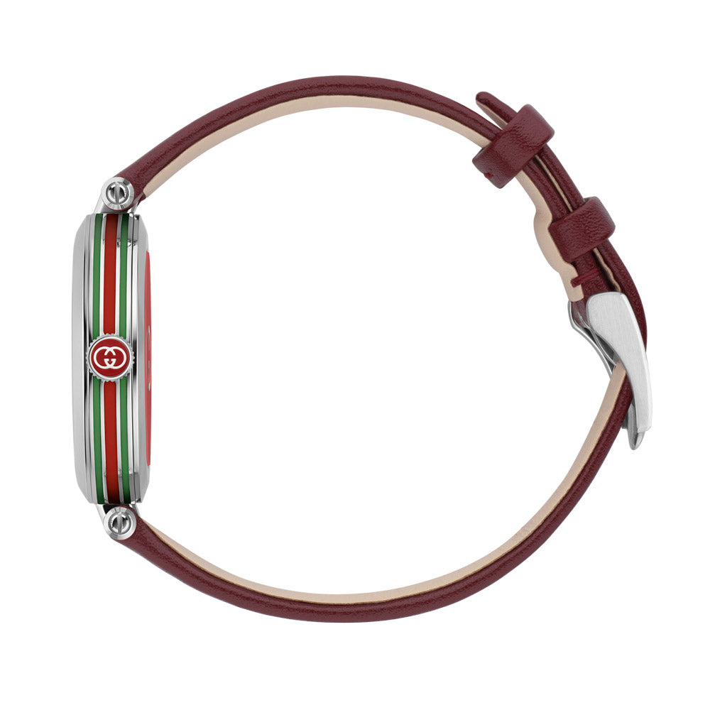 Inspired by archival codes, the Model 2000 design from the Cruise 2025 collection combines Italian style with Swiss craftsmanship for a polished and minimalist look in both jewellery and watches. The iconic silver guilloché dial is complemented by a bold red leather strap, adorned with historic codes of the renowned House.