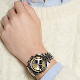 Chronograph: Central 60 seconds hand, 12 hours counter at 6 o'clock and 30 minutes counter at 9 o'clock