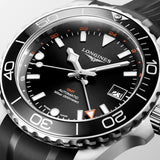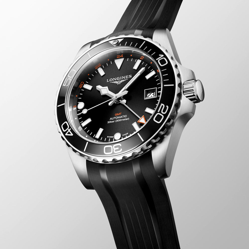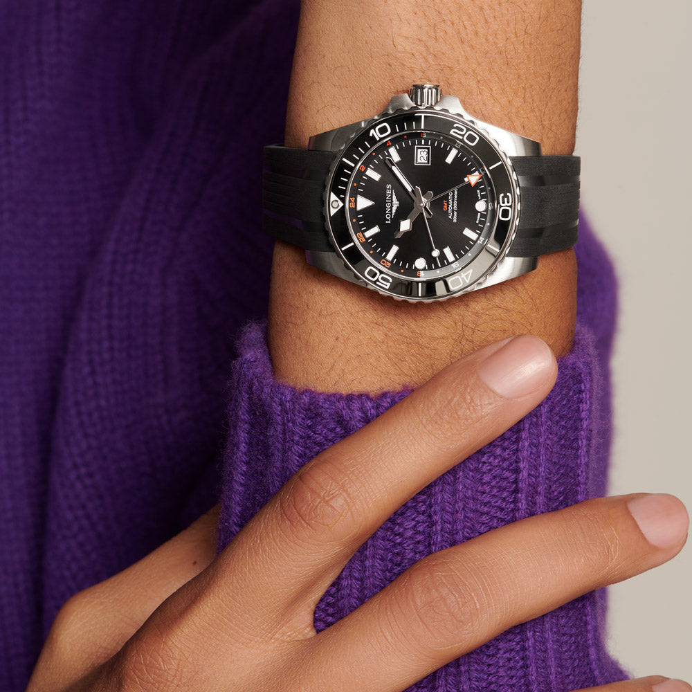 This HydroConquest GMT features a 41mm stainless steel case, a unidirectional notched black ceramic bezel with luminescent capsule, and a black dial. It comes with either a stainless-steel bracelet or black rubber strap. The case and crown are secured with a screw-down closure.