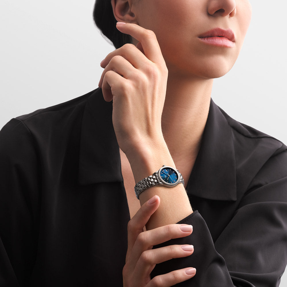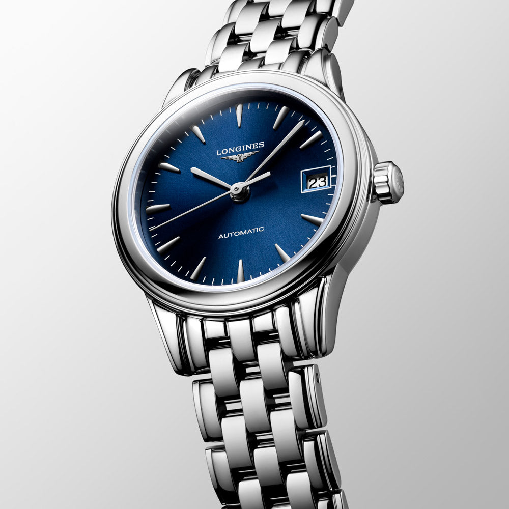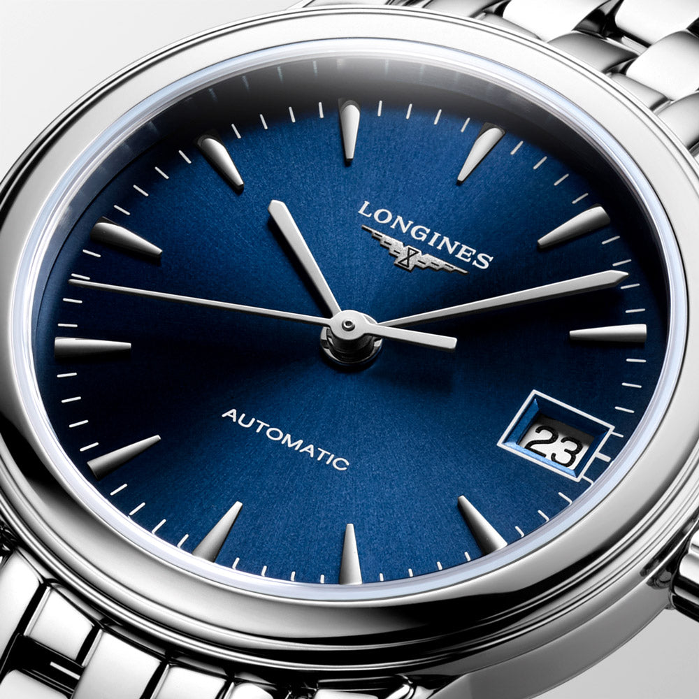 Longines Ladies Flagship Watch with blue dial with silver tone hands in stainless steel. Including date display at the 3 o'clock position.