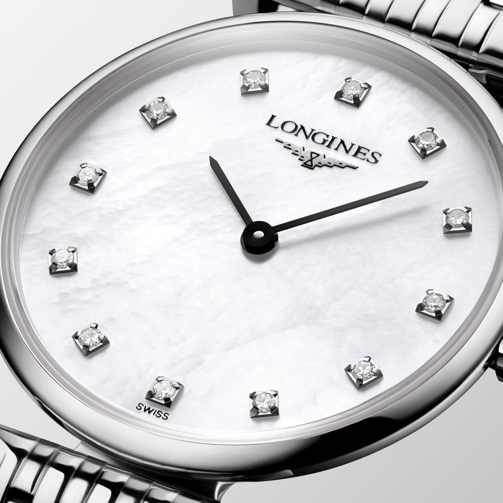 This sophisticated Longines La Grande Classique watch boasts a 0.048ct diamond-studded mother-of-pearl dial and a 24mm stainless steel case for durability. The quartz movement and scratch-resistant sapphire crystal glass ensure that this watch is a timeless classic with style and grace. Secured with a stainless steel bracelet and deployment clasp, this elegant timepiece is the perfect choice for the modern woman.