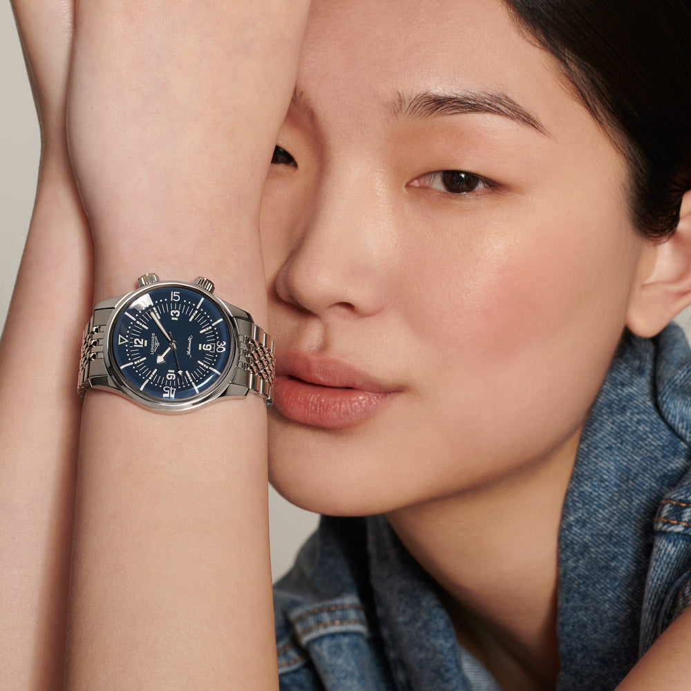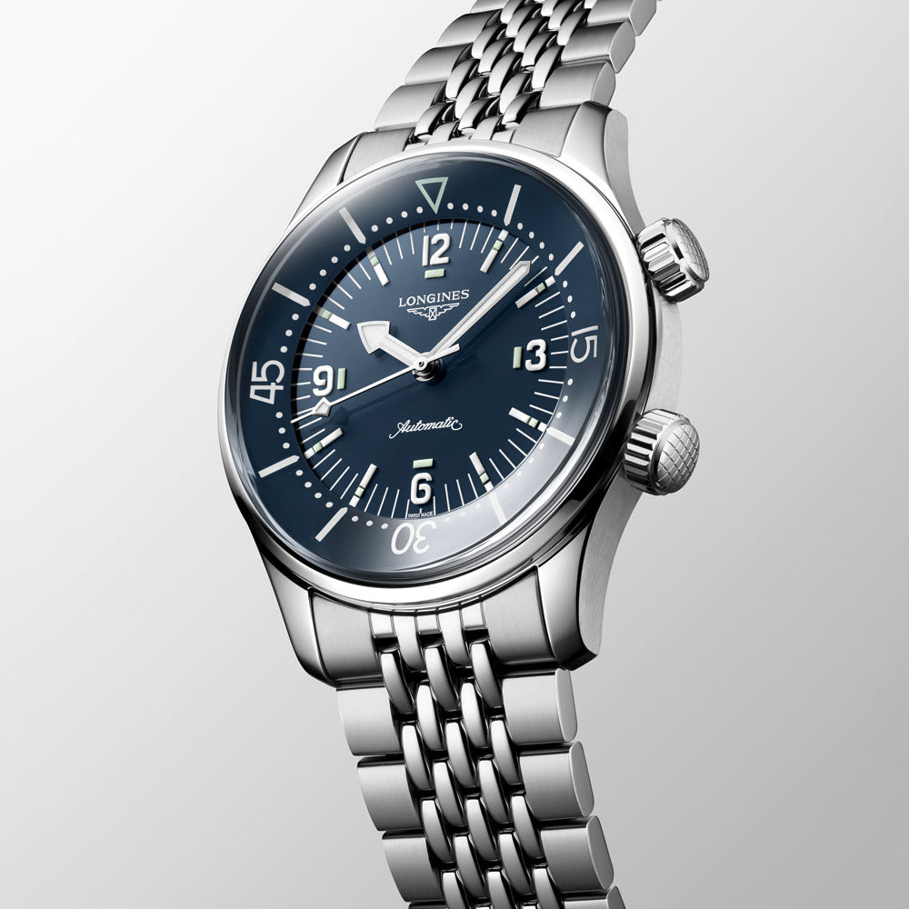 The LONGINES LEGEND DIVER boasts two crowns and an internal rotating bezel, making it instantly recognisable. An exact replica of the 1959 model, it measures 39mm in diameter.